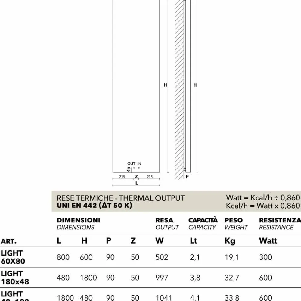 | Maße | L.480 mm, H.1800 mm, P.90 mm, Achsabstand 50 mm, Wärmeleistung 997 Watt, Kapazität 3,8 l, Gewicht 32,7 kg |