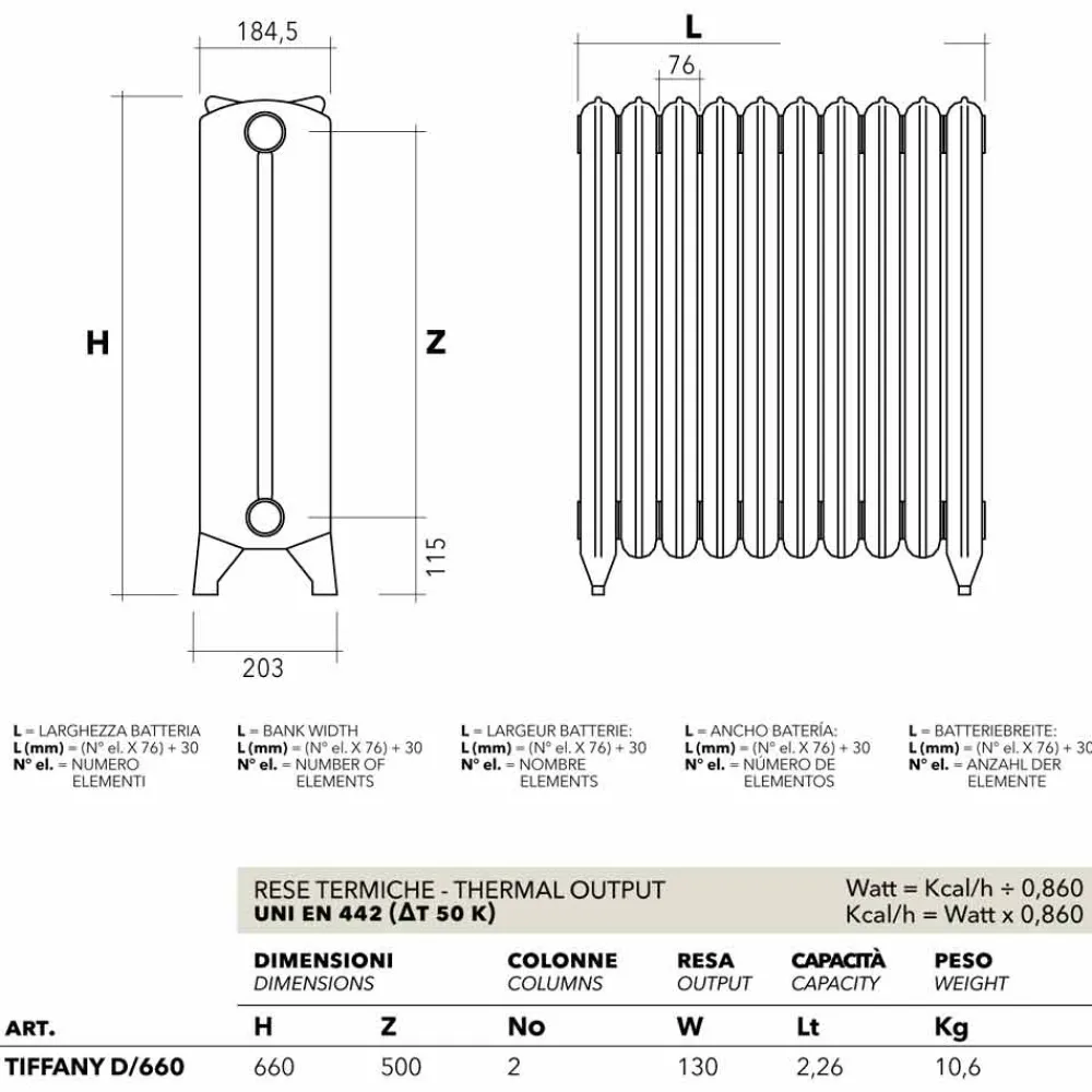| Maße | Maße für Einzelelement: H. 660 mm, Achsabstand 500 mm, Säulen 2, Wärmeleistung 130 Watt, Kapazität 2,26 l, Gewicht 10,6 kg |