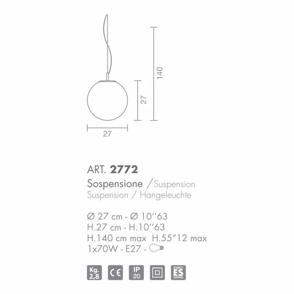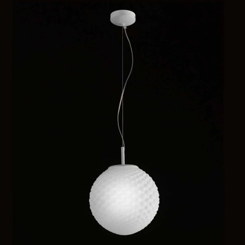 Domino ist eine reichhaltige Kollektion von Lampen aus mundgeblasenem Glas mit einer speziellen alveolaren Prägung, die das Glas selbst verschönert. Der Diffusor kann zylindrisch in zwei Größen und kugelförmig in einem sein, außerdem ist er in drei Farben erhältlich: Satinweiß, Bernstein und Rauch; und vorbereitet für den Gebrauch von 1 70W E27 Birne.