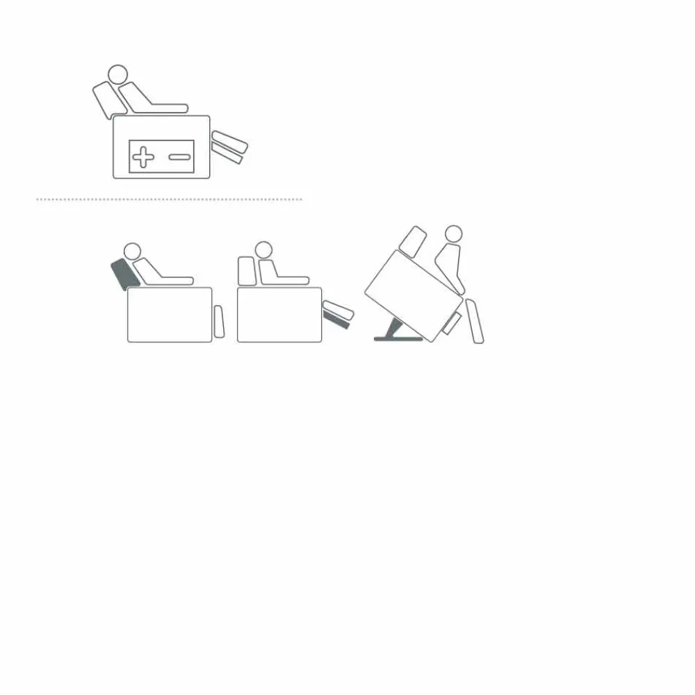 – 60-Zyklen-Batterie-Kit: ermöglicht die Verwendung des Sessels in jeder Ecke des Hauses, auch weit von der Steckdose. Die Batterie ermöglicht 60 vollständige Autonomiezyklen. Warnung: Das Batterie-Kit ist nicht mit den Optionen kompatibel Lordosenstütze / Vibro-Kit / Thermo-Kit.