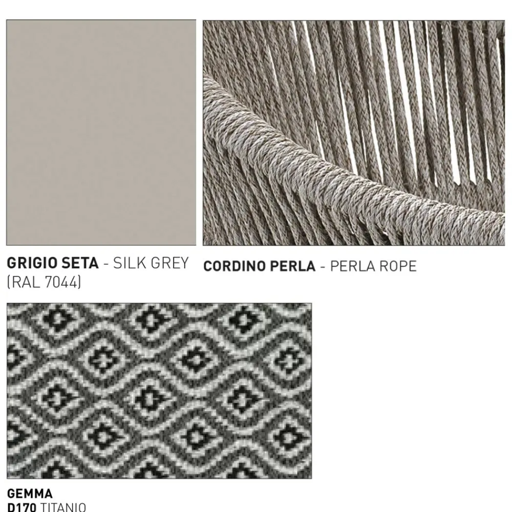 Gartenhocker bestehend aus einem pulverbeschichteten Aluminiumrahmen mit seidengrauem Finish, handgewebter Faser mit Perlmutt-Finish und Sitzfläche mit Polsterung . Ein Möbelstück für Außen- oder Innenräume, das den Komfort und Stil der Umgebung für ein einladendes Ergebnis und eine zeitgemäße Ästhetik vervollständigt.