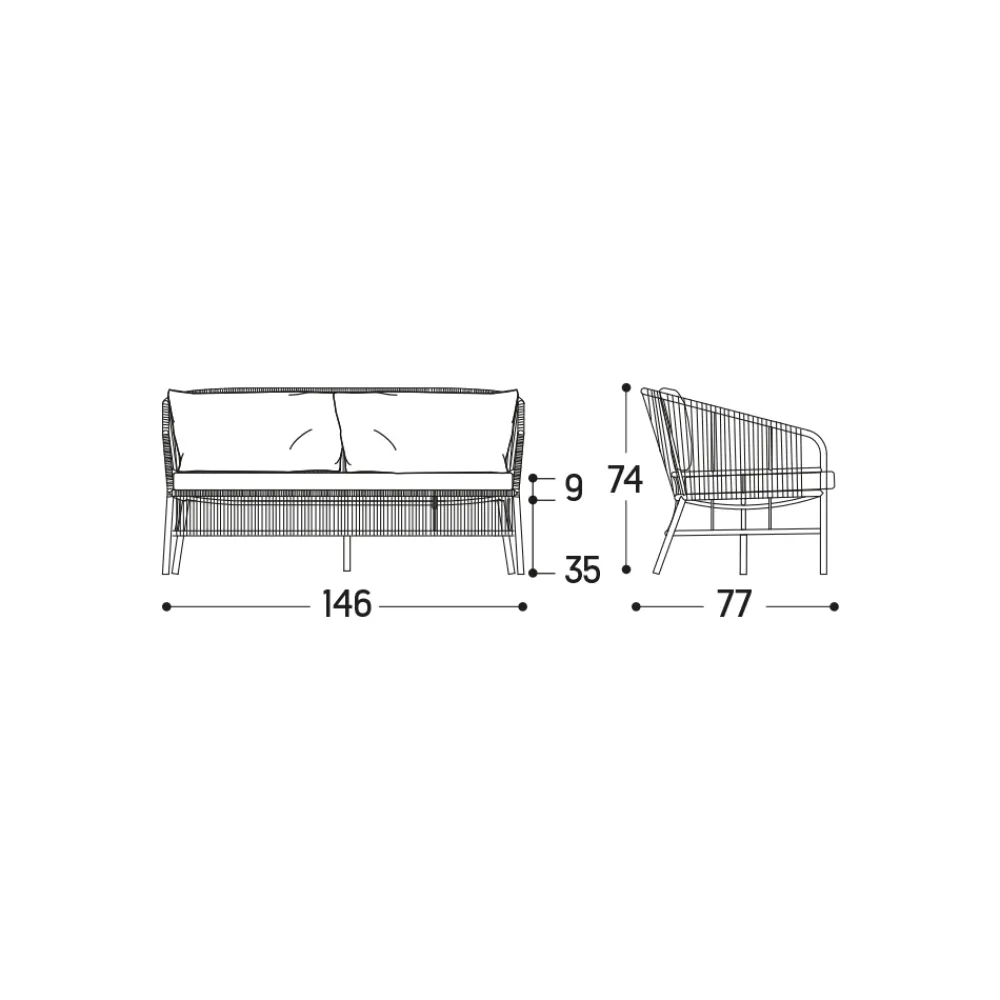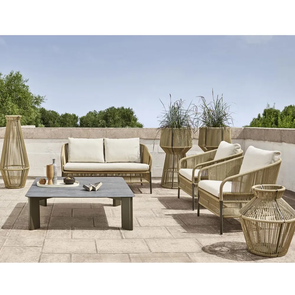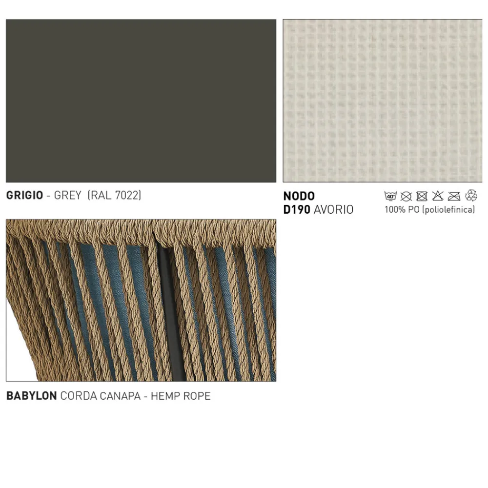 Zweisitzer- Gartensofa mit Struktur aus pulverbeschichtetem Aluminium mit grauer Oberfläche , handgeflochtener Sitz aus hanffarbenem Seil und 3 elfenbeinfarbene Kissen mit Dryfeel-Füllung enthalten. Eine innovative und frische Einrichtungslösung, bereichert durch die wunderbaren vorgeschlagenen Oberflächen, die die Außenumgebung mit Raffinesse verwandeln.