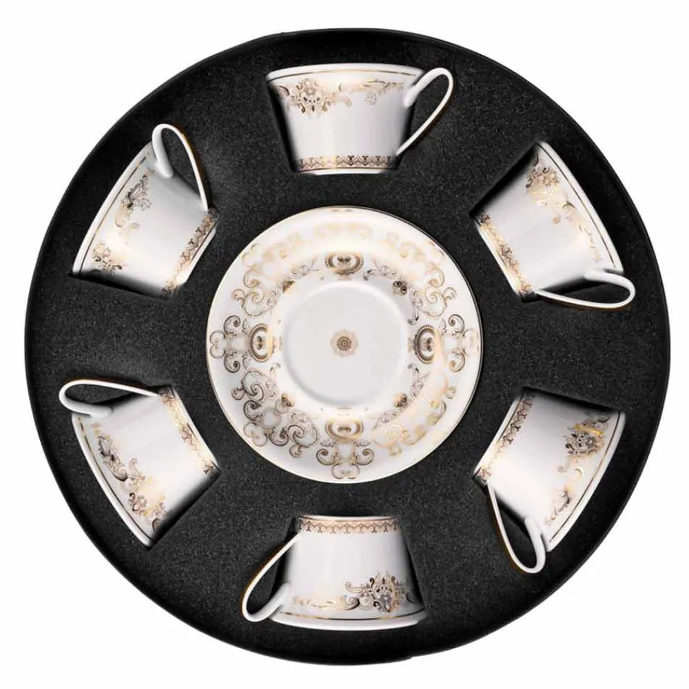 In diesem Set mit 6 Teetassen Die ganze Raffinesse und der Luxus der neuen Geschirrkollektion Medusa Gala sind darin enthalten, die in Design und Dekoration die traditionellen Versace- Motive neu interpretiert: Das Medusa-Symbol wechselt sich mit raffinierten barocken Ornamenten in kostbarem Goldfiligran ab. Ein spannender Kontrasteffekt zwischen dem Weiß des Porzellans und reinem Gold schafft eine perfekte Inszenierung, modern und zugleich einzigartig.
