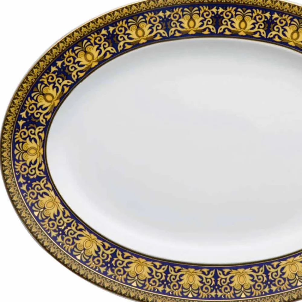 Der fantastische und moderne ovale Teller im Format 40,5 x 30 cm von Versace ist Teil der eleganten modernen Kollektion, die, kombiniert mit einem faszinierenden und raffinierten Glamour, an vergangene Epochen erinnert und in dem leuchtenden Blauton Medusa Blue zum Ausdruck kommt.