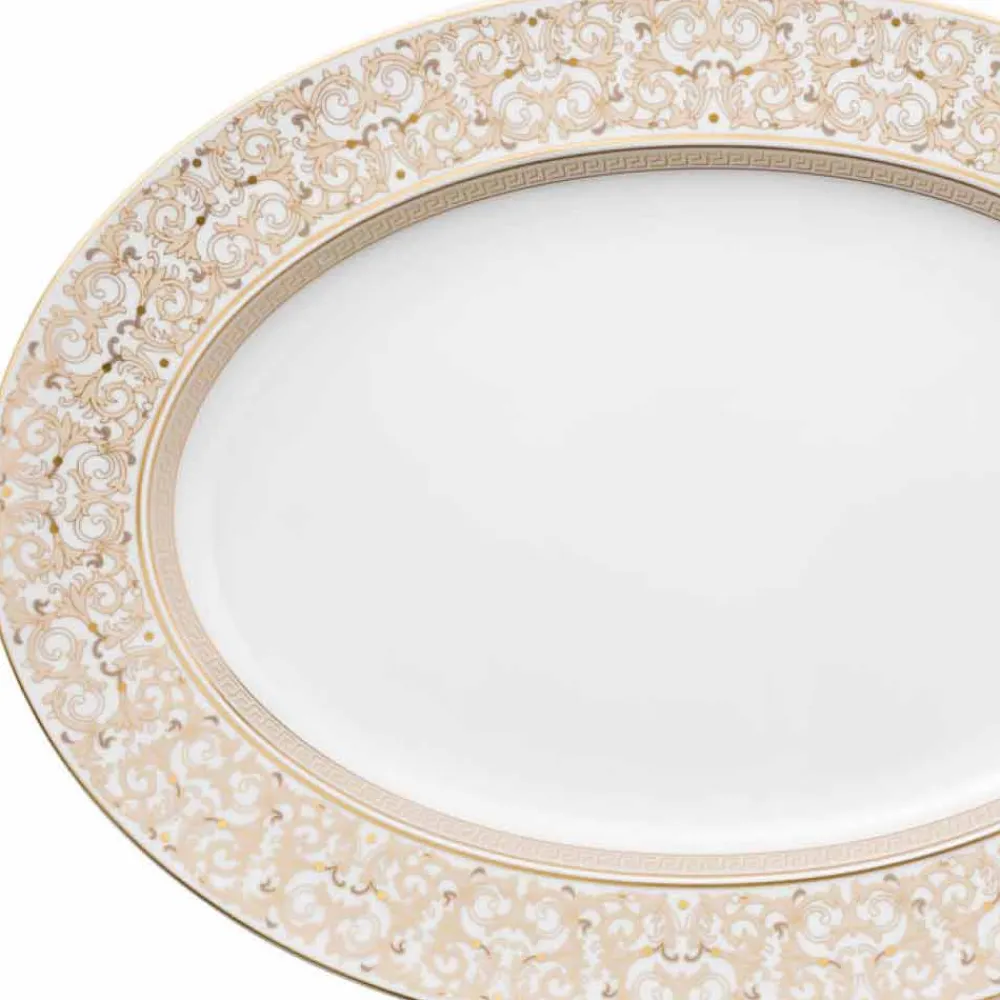 Der 40,5 x 30 cm große ovale Teller von Versace ist Teil der raffinierten und luxuriösen Tischkollektion Medusa Gala.