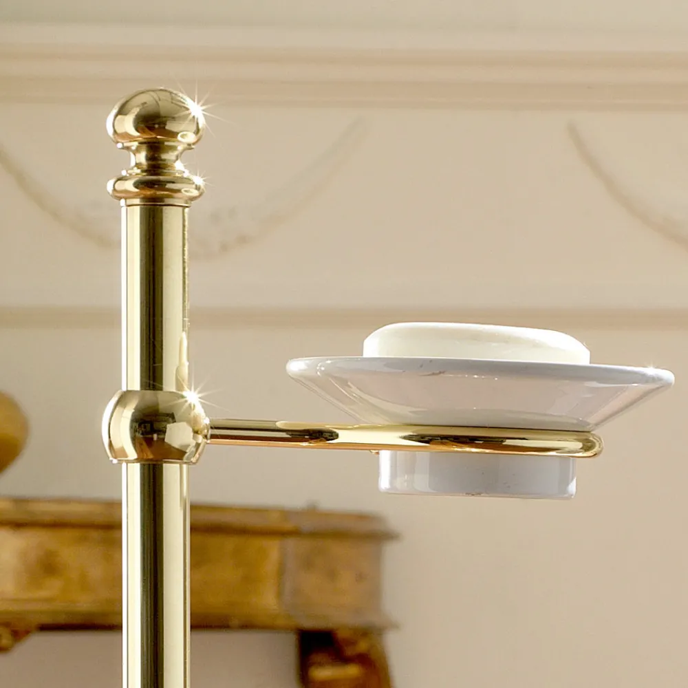 Bodenhandtuchhalter mit Seifenschale aus Messing und Keramik, hergestellt in Italien, Rouen.