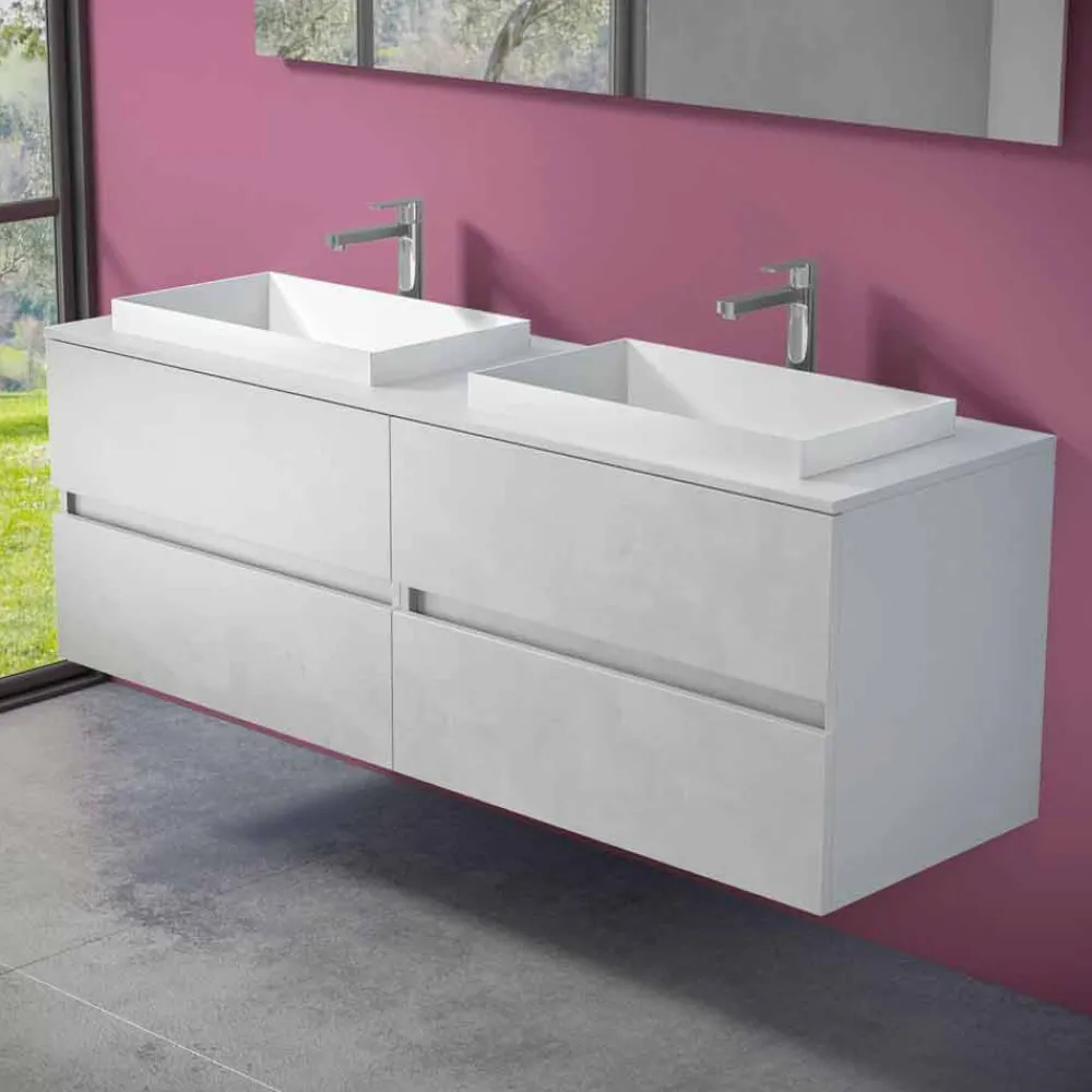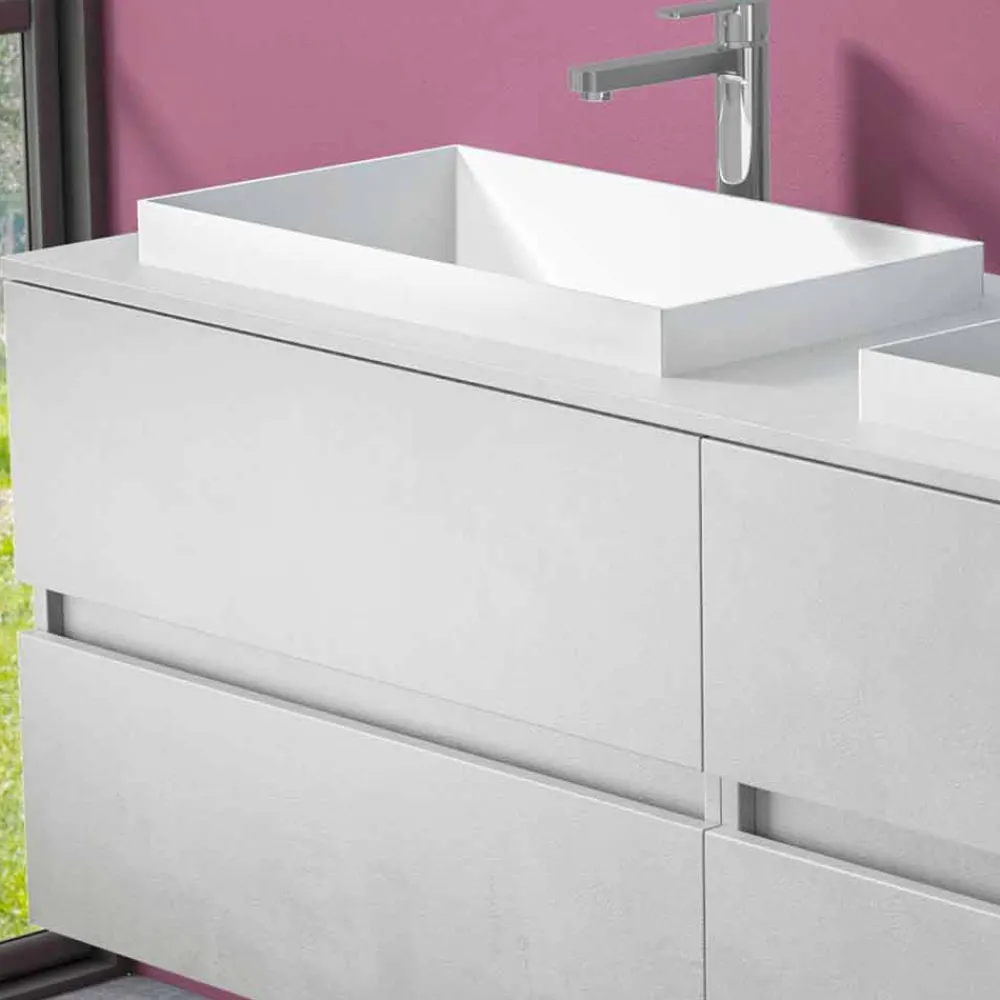 Die beiden rechteckigen eingebauten Waschbecken bestehen aus Solid Matt, einem opaken weißen Mineralharz , und sind mit opakem Gelcoat versehen, wodurch das Produkt wasserdicht wird.