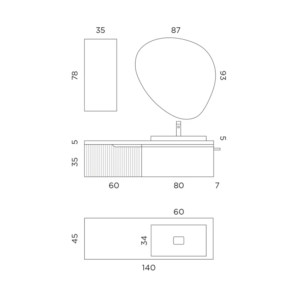 - Waschbecken: Länge 60 cm x Tiefe 34 cm x Höhe 15,7 cm