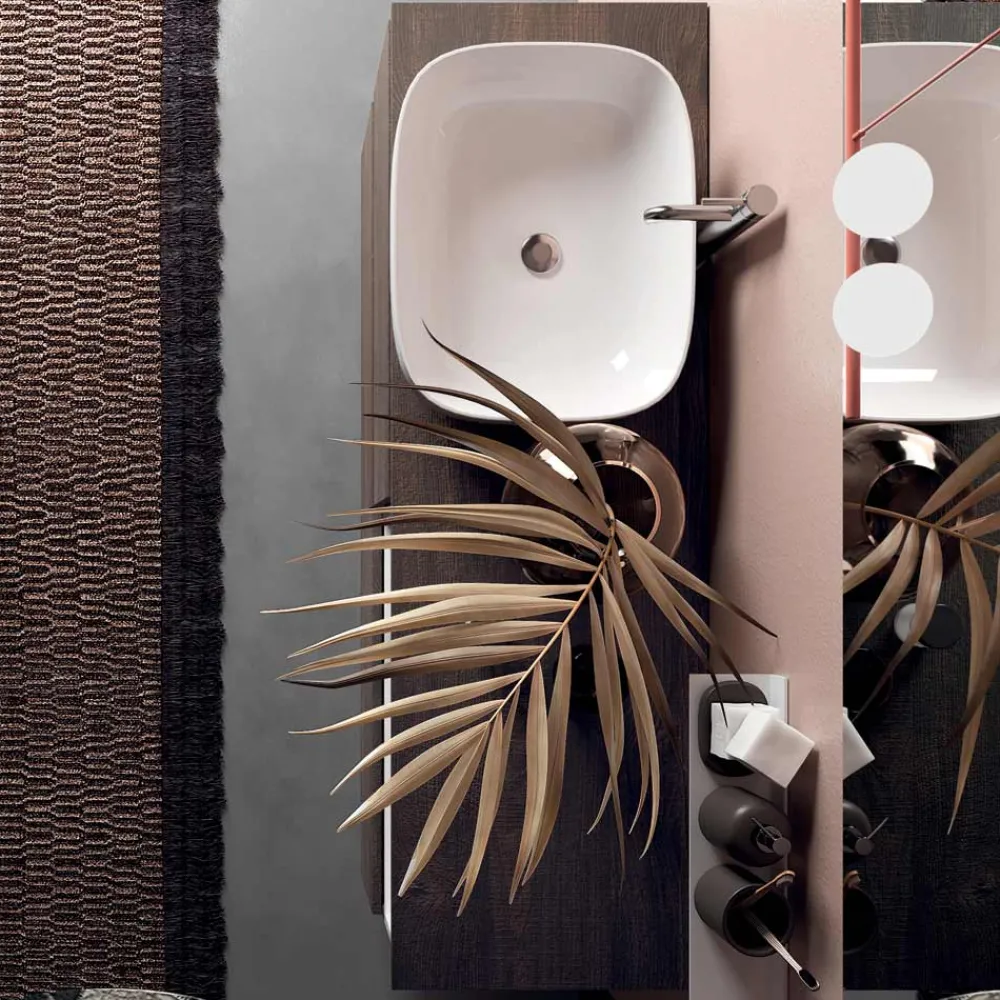 Badezimmerkomposition mit dunkelbraunem Sockel und Keramikwaschbecken „Made in Italy“.