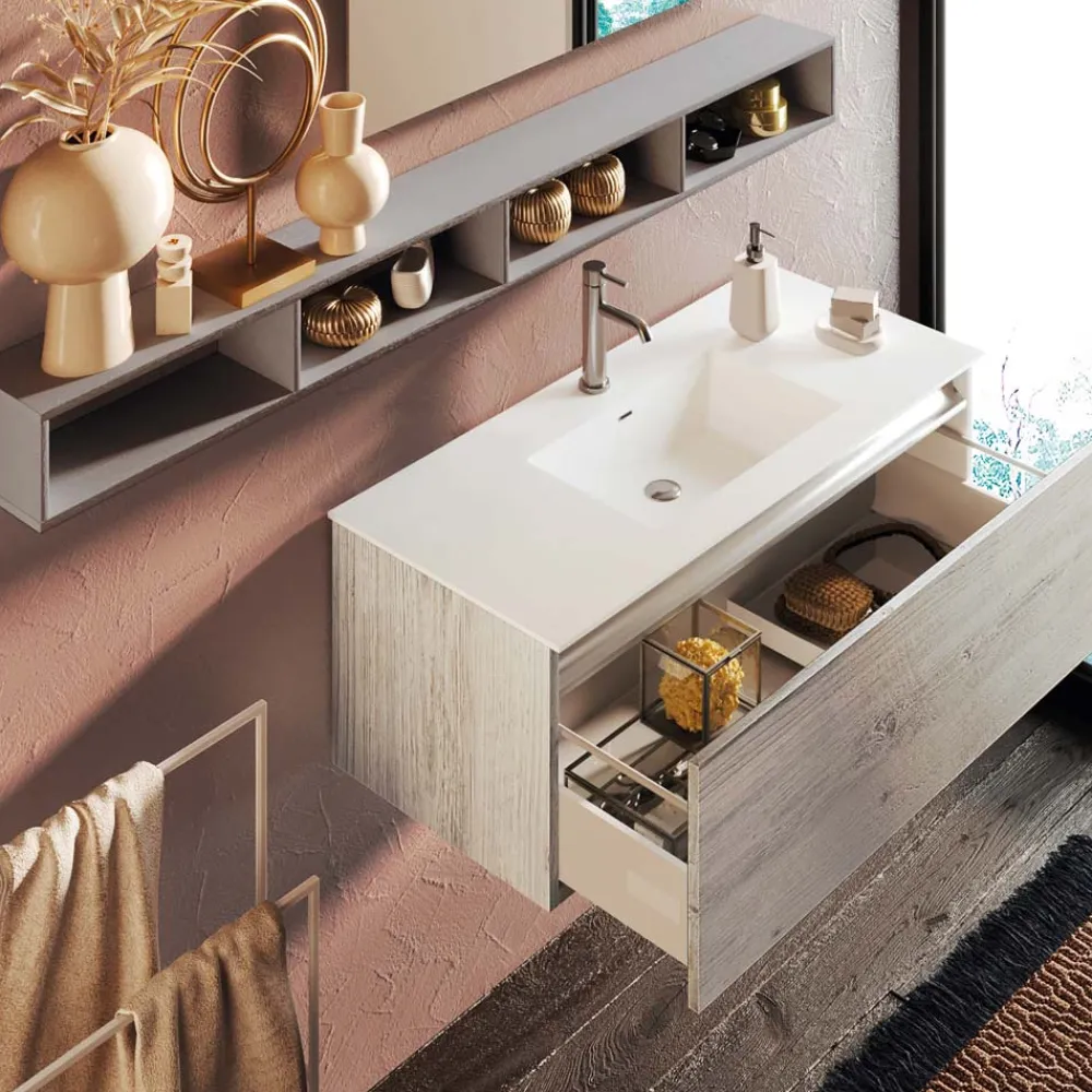 Badezimmerkomposition mit Spiegel mit integrierter Lampe und Waschbecken aus Kunstharz „Made in Italy“.
