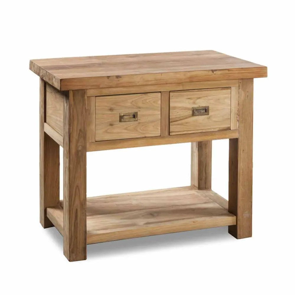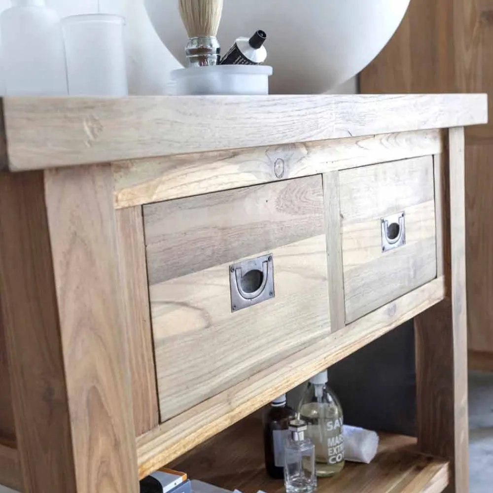 Moderner Badezimmerschrank aus naturbelassenem Teakholz mit 2 Schubladen.