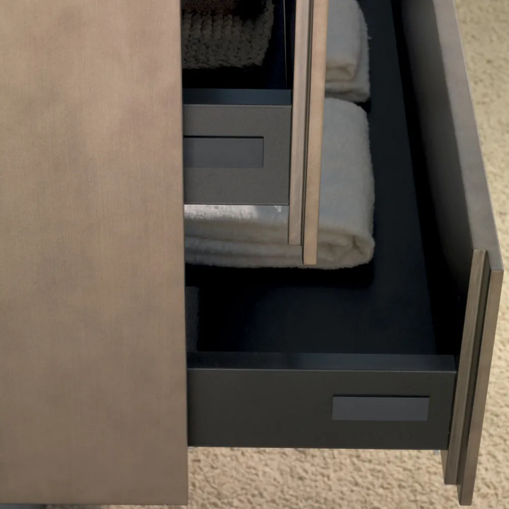 Am Ende des funktionalen Designs steht das Gesamtöffnungssystem mit Push & Pull-System und die Spiegel mit 4 sandgestrahlten Seiten für integrierte LED-Beleuchtung , kombiniert mit einem antik platin lackierten Metallrahmen.