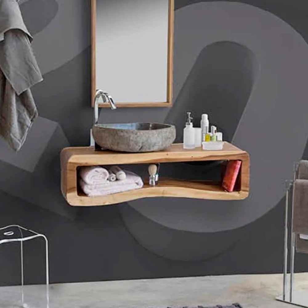 Abgehängte Badmöbelkomposition aus Teakholz.