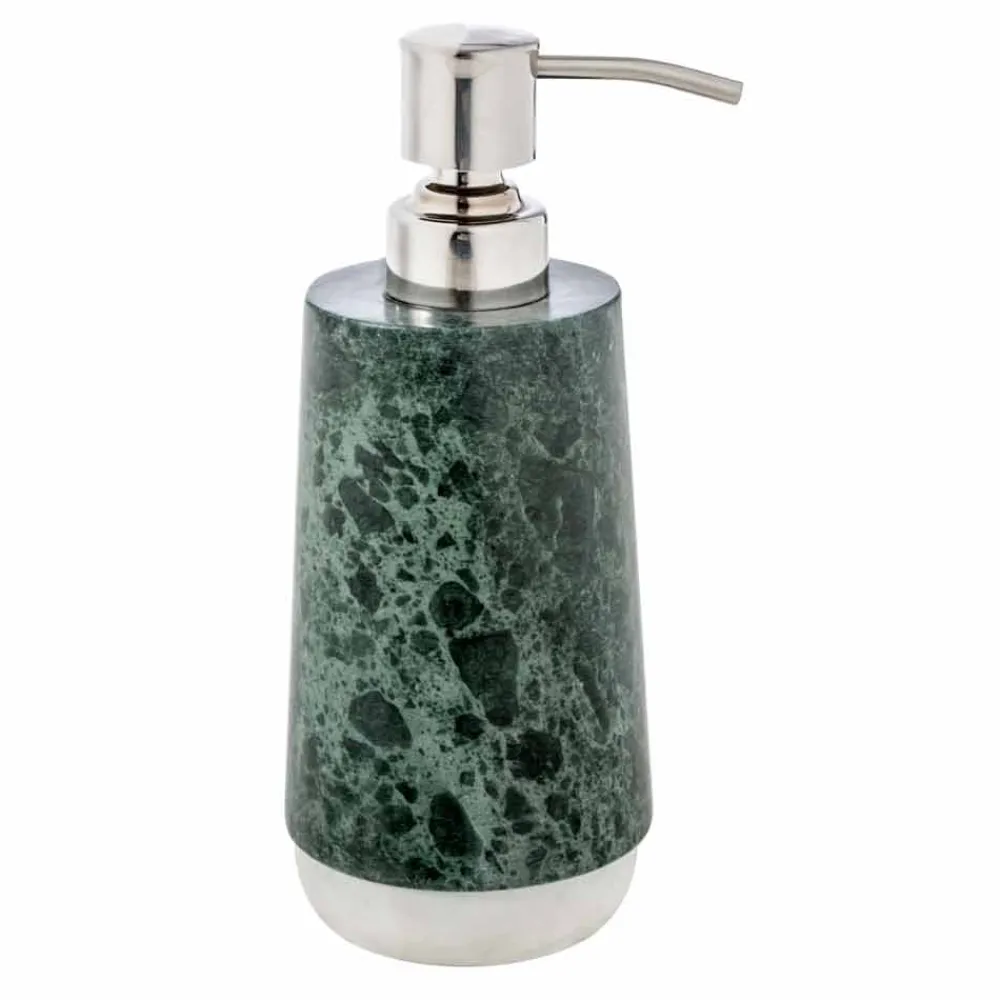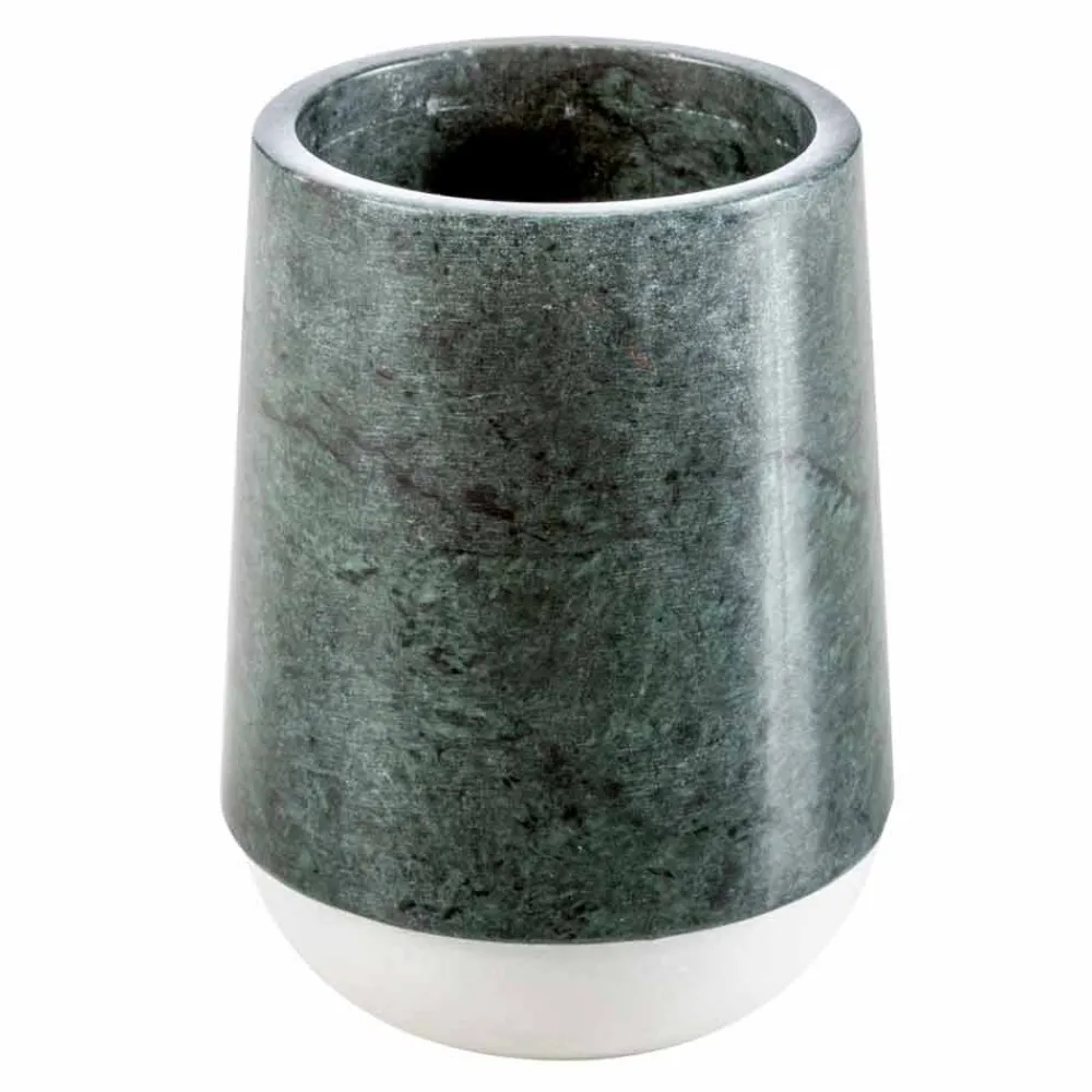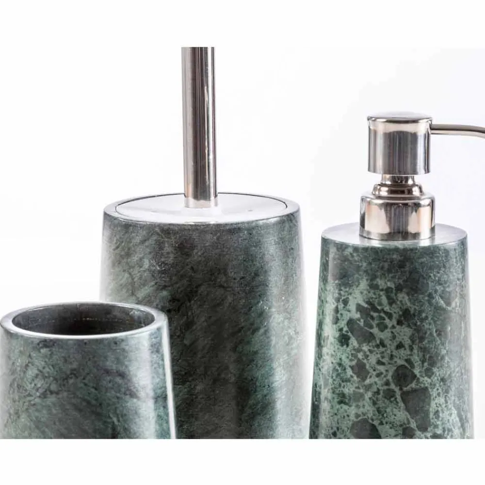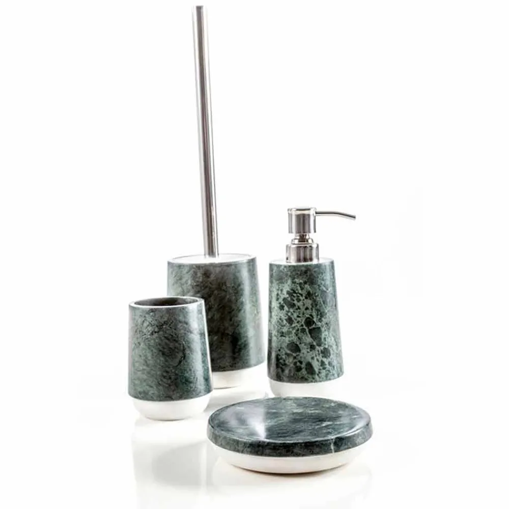 Bombei ist das Badezimmer-Accessoires-Set aus grün gesprenkeltem Marmor, reich an Adern, das auf einem Sockel aus Calacatta-Marmor ruht.