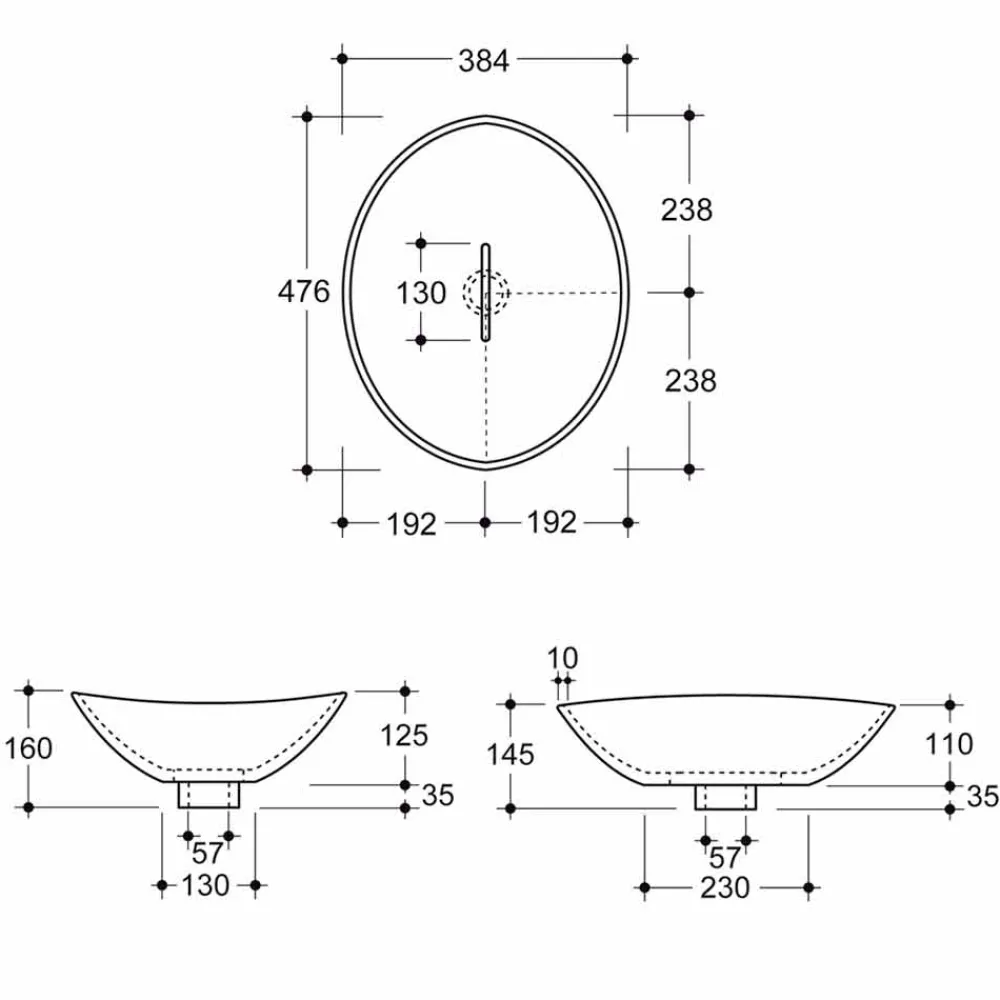 Unregelmäßig geformter Waschtisch oder „Becken“, der an eine Mandelform erinnert, ausgestattet mit einem durchgehenden Wasserablauf.
