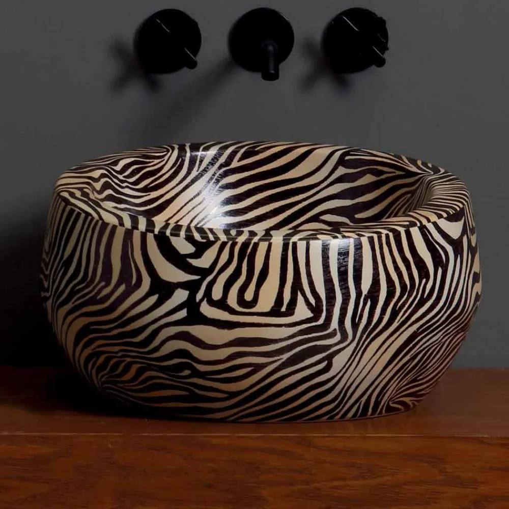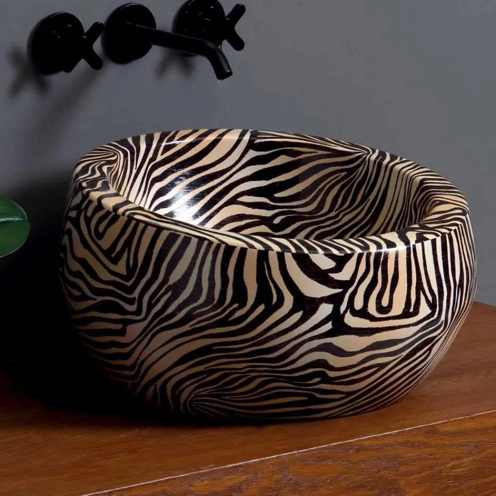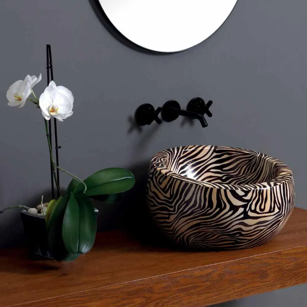 Elisa ist ein Aufsatzwaschbecken aus Keramik mit orangefarbenem Zebrafinish und hellen und entschiedenen Linien.