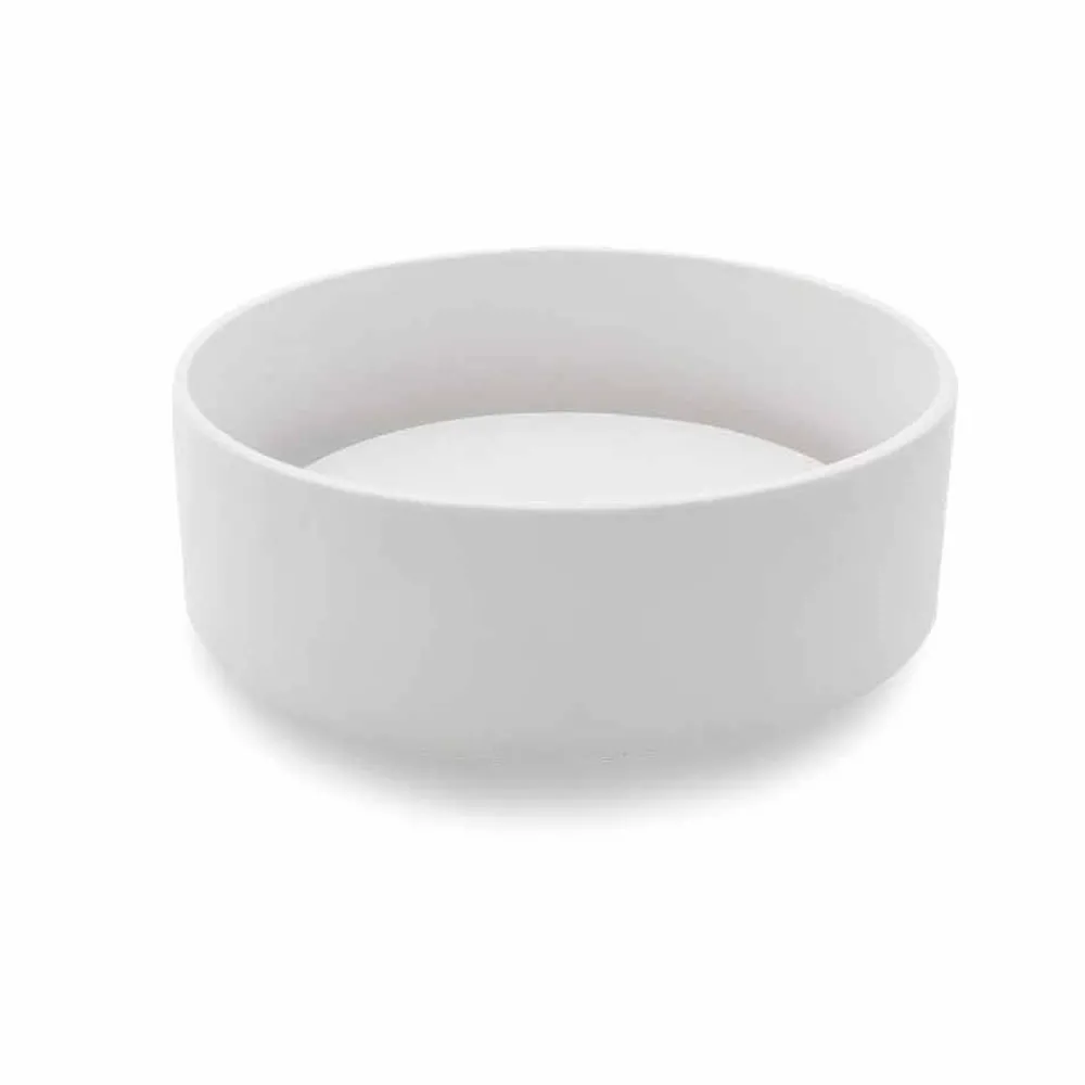 Aufsatzwaschbecken aus weißem Harz mit Innenplatte, die den zentralen Ablauf abdeckt.