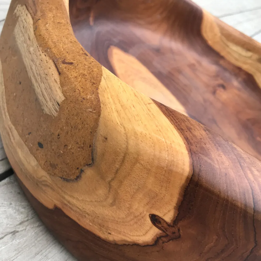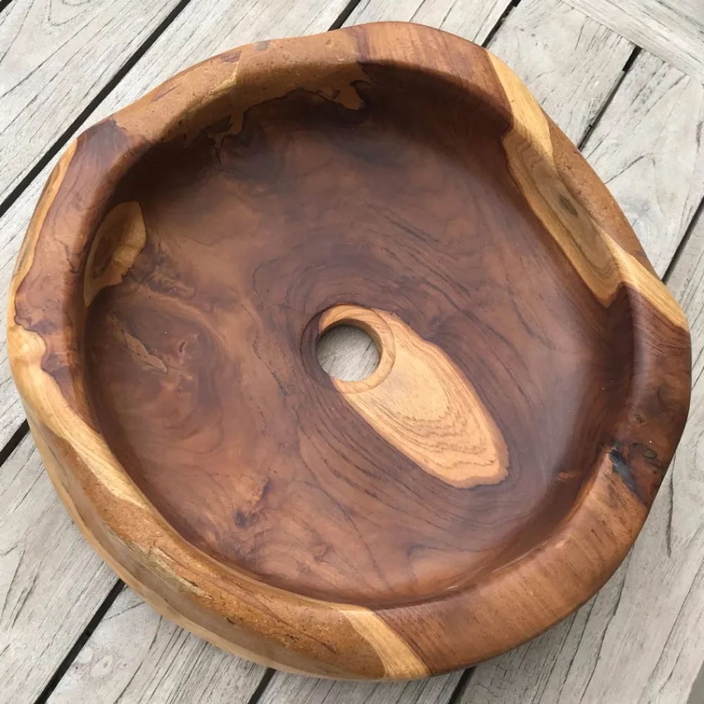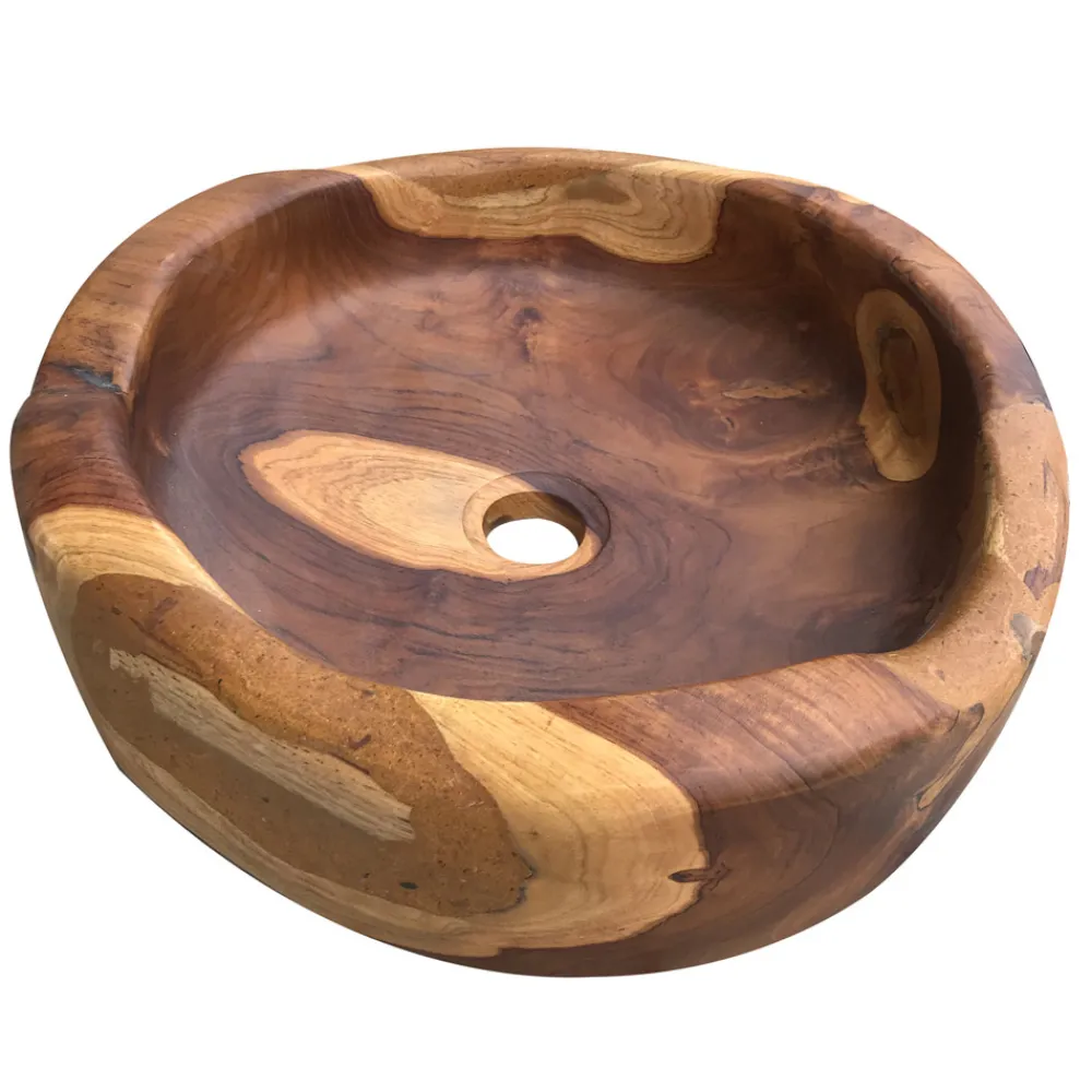 Natürliches und poliertes Teakholz in einer essentiellen und praktischen Form. Unbehandeltes Holz gibt die Düfte und Farben tropischer Wälder zurück. Aufsatzwaschbecken aus glattem und naturbelassenem Teakholz.