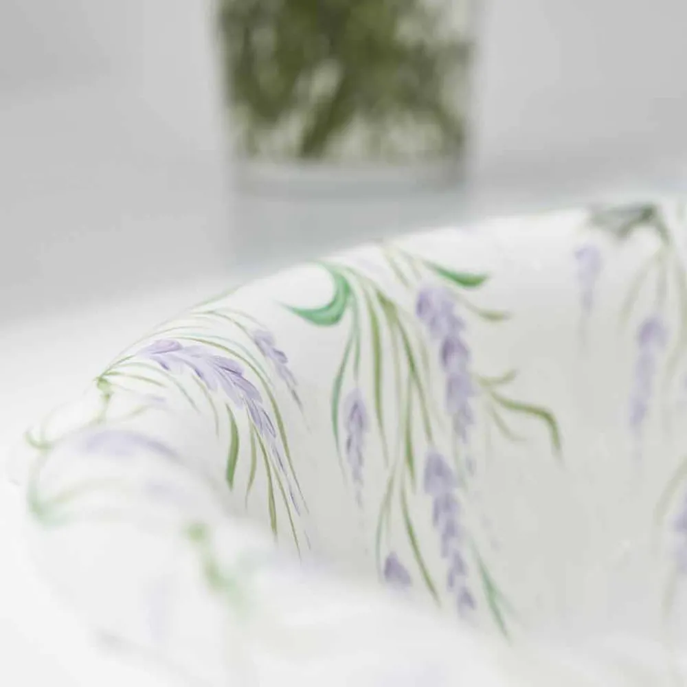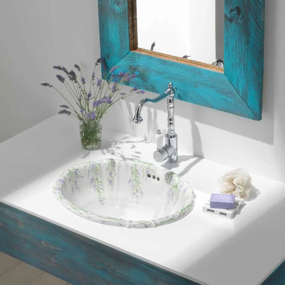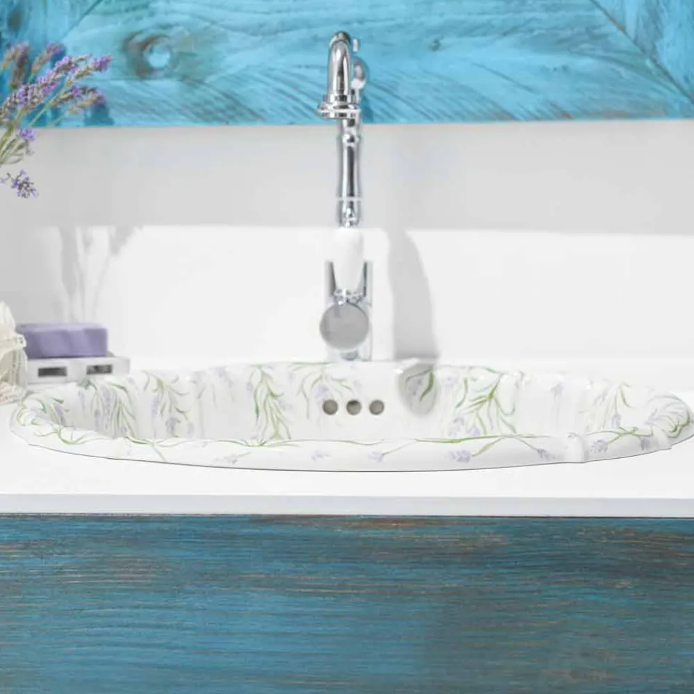 Dank seines klassischen und raffinierten Designs lässt es sich perfekt in jeden Stil Ihres Badezimmers integrieren. Einbauwaschbecken aus Porzellan, handdekoriert in Italien, Santiago Einbauwaschbecken made in Italy aus feinem weißem Porzellan mit Lavendelzweigdeko, handgefertigt mit Pinseltechnik.