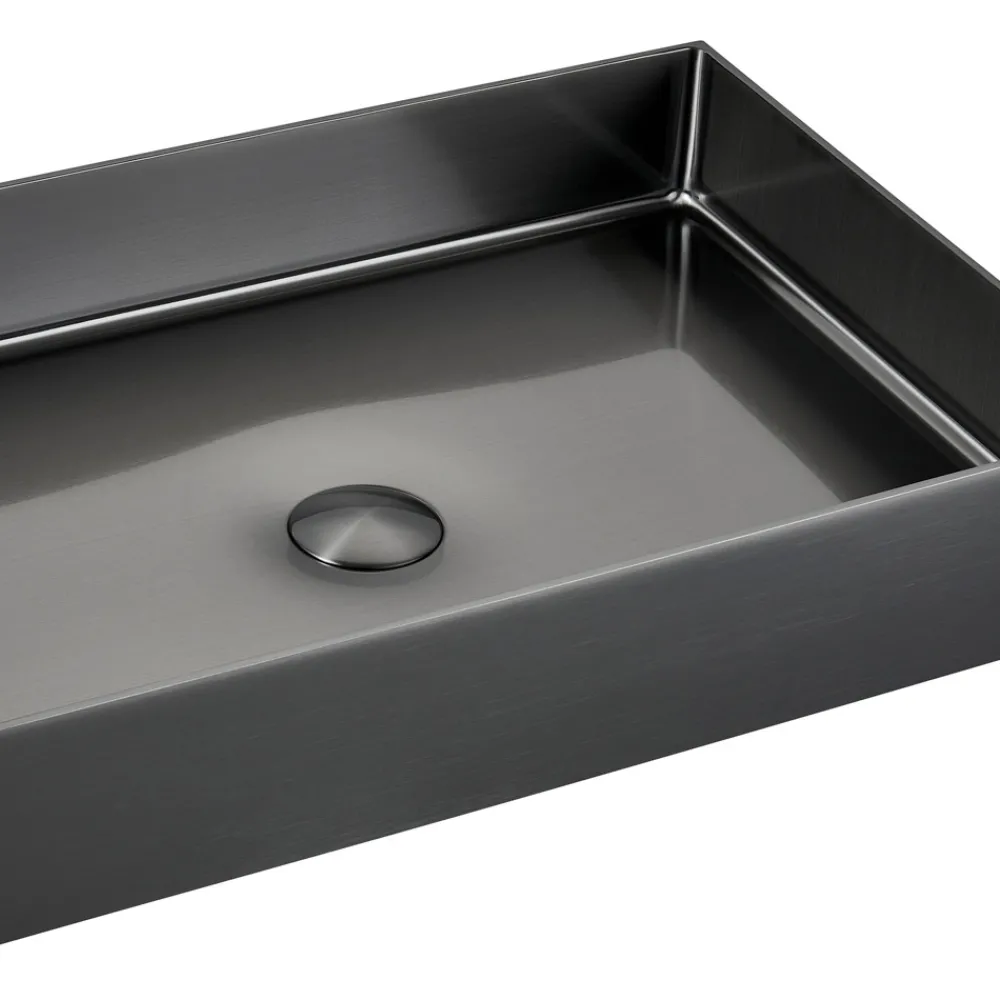 Das rechteckige Aufsatzwaschbecken aus 3 mm starkem Edelstahl SUS 304 ist ein Juwel an Design und Funktionalität. Es ist aus einem einzigen Metallblech gefertigt und bietet eine klare, moderne Ästhetik. Die Endbearbeitung der PVD+Nano-Beschichtung in Kombination mit sorgfältigem Bürsten verleiht dem Objekt ein attraktives und fast rätselhaftes Aussehen und verbessert den Glanz sowie die Widerstandsfähigkeit gegen Flecken und Kratzer. Das Design zeichnet sich durch ausgewogene Formen und ideale Proportionen aus in drei Ausführungen , die sich elegant an jede Umgebung anpassen. Darüber hinaus machen raffinierte Details wie die mitgelieferte passende Ablaufabdeckung und der völlige Verzicht auf sichtbare Schweißnähte dieses Waschbecken zu einem wahren Meisterwerk der Handwerkskunst und des Designs und machen es zu einem herausragenden Stück für Badezimmer mit luxuriösem und modernem Flair.