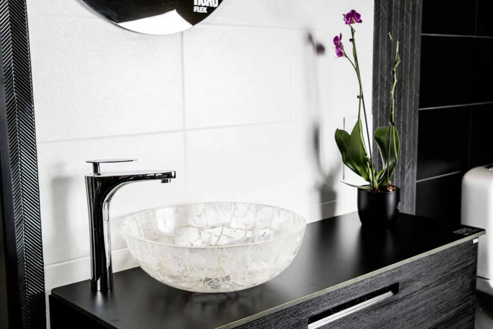 Handwerkskunst und Design für die Badeinrichtung: Aufsatzwaschbecken aus Stein.