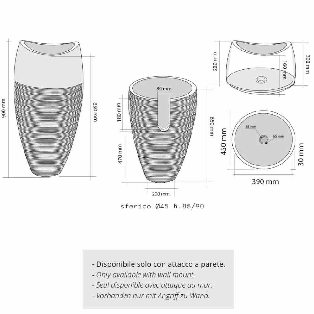 Ø 45 x h 85/90 cmKegelförmiger Sockel mit weicher und bewusster Geometrie aus Marmor und Naturstein. Aus einem einzigen Block ausgehölt und handverarbeitet, mit spezieller Oberflächenbeschichtung in der Innnen und Außenseite. Dieses Waschbecken passt sich jeden unterschiedlichen Einrichtungsstil an, ob retro, schick und modern oder einfach schlicht, dieses Standwaschbecken ist durch seine Kegelform nicht nur platzsparend und bequem zum festhalten, wenn man morgens halbmüde davor steht, sondern auch stilisch sehr trendig – da werden müde Augen schnell und glücklich munter.