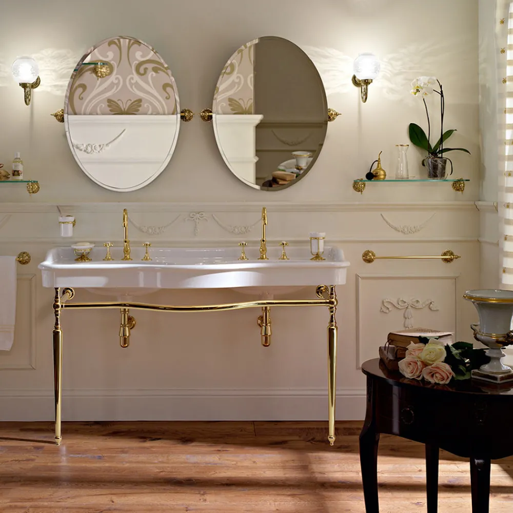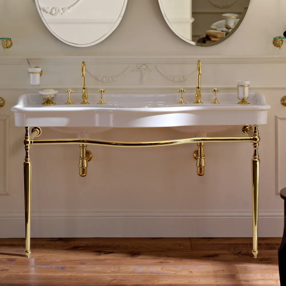 Vintage-Badezimmerkonsole mit Doppelschüssel aus weißer Keramik und Paulina-Metall, hergestellt in Italien.