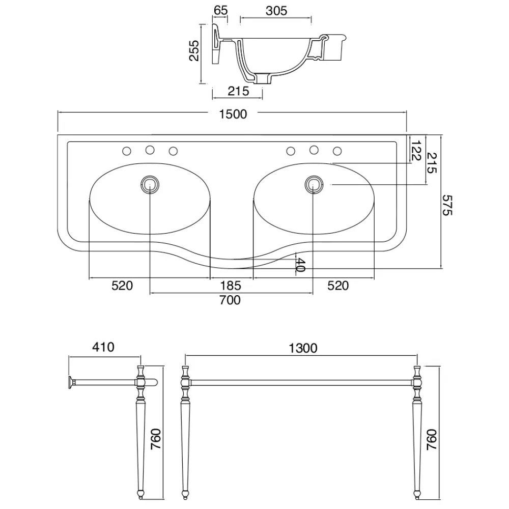 - Platte L 150 x T 57,5 x H 25,5 cm, Basis L 130 x T 41 x H 76 cm, mit Doppelwaschbecken und 1 oder 3 Hahnloch-Spritzschutz für Waschbecken – L 1500 mm;