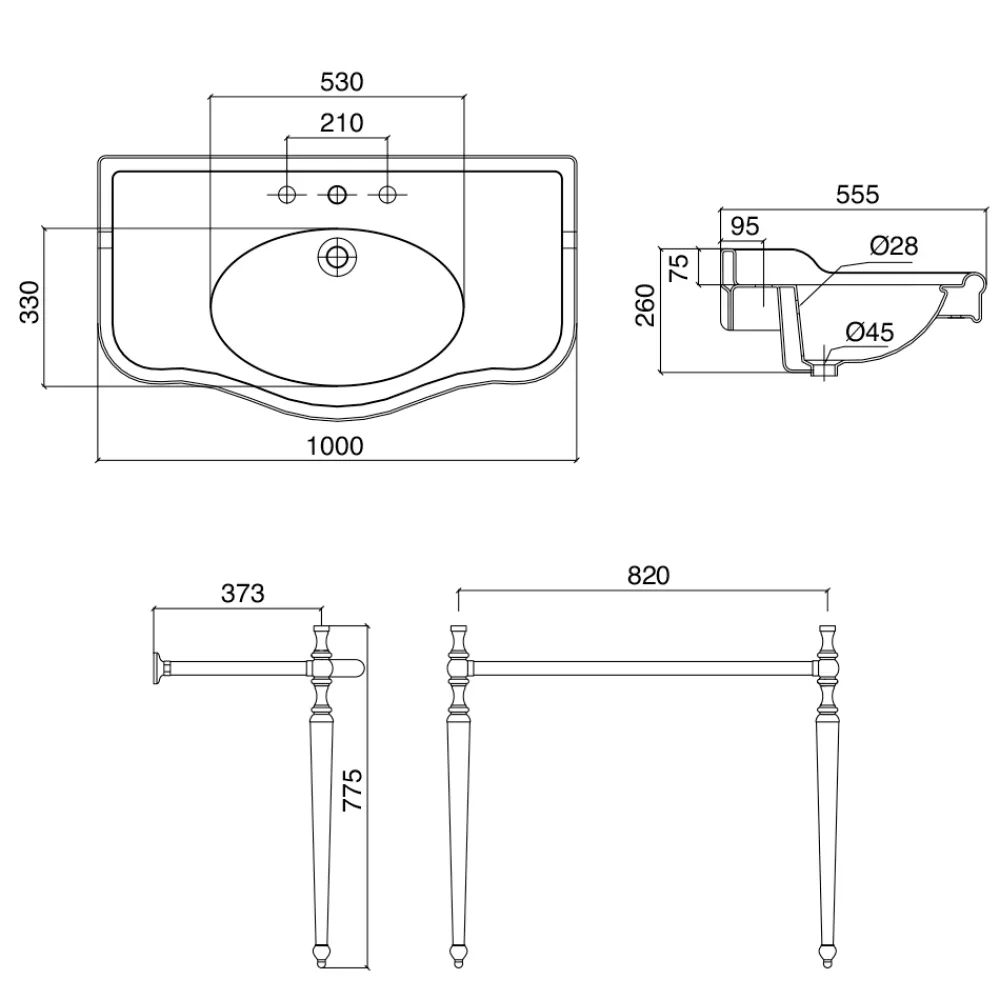 - Platte B 100 x T55,5 x H 26 cm, Sockel B 82 x T 37 x H 77,5 cm, mit Einzelwaschbecken mit Spritzschutz und Spritzschutz 1 oder 3 Hahnlöcher – L 1000 mm;