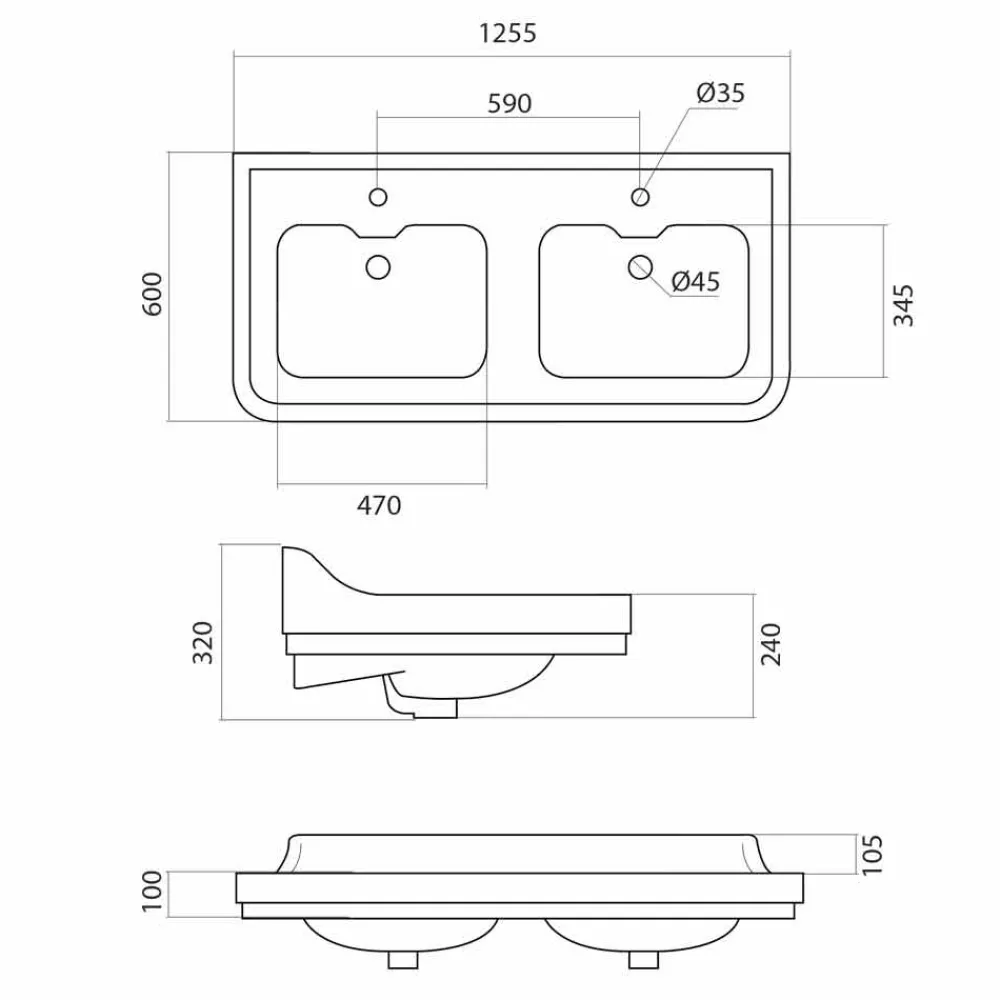 Aufsatzwaschtisch mit Doppelwaschbecken komplett aus weißer Keramik.