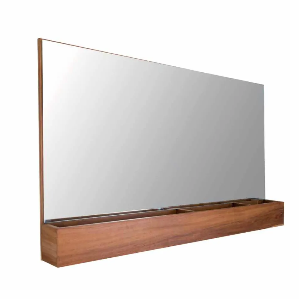Abgeschrägter Spiegel, der auf einer natürlichen Teakholzplatte angebracht ist und mit einem Tablett auch in Teakholz ausgestattet ist. Die praktischen Fächer eignen sich ideal zur Aufnahme von Kosmetika, Spendern, Zahnbürstenhaltern, etc… Aufsätze nur zur waagerechten Positionierung.