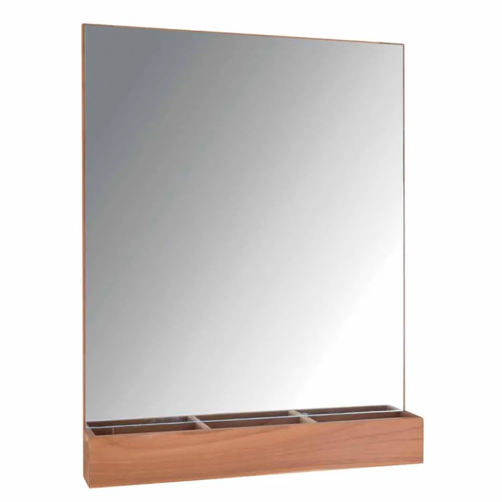 Abgeschrägter Spiegel , der auf eine natürliche Burma-Teakplatte aufgebracht und mit einem Teakholztablett ausgestattet ist. Die praktischen Fächer sind ideal zur Aufnahme von Kosmetika, Spendern, Zahnbürstenhaltern etc… Aufsätze nur zur vertikalen Positionierung.
