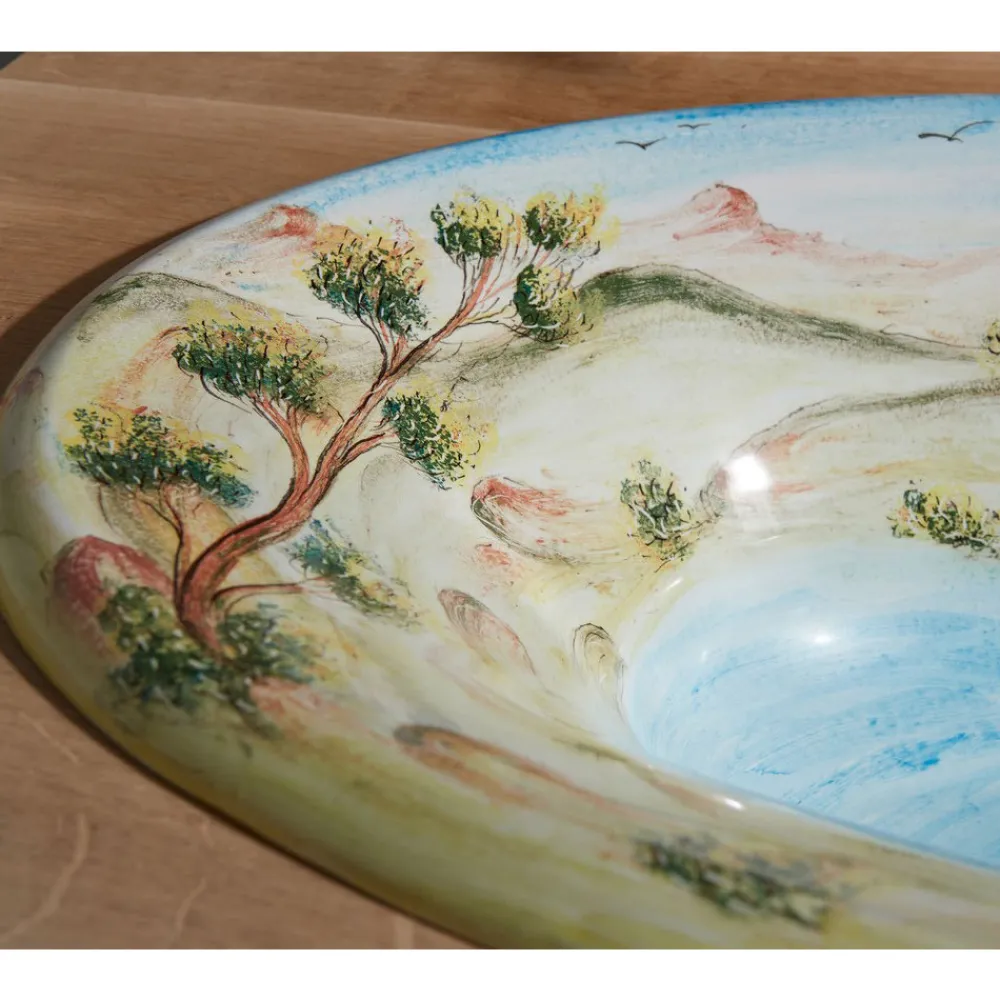 Halbeingelassenes Badezimmerwaschbecken aus handbemaltem Schamotteton mit Deruta-Landschaftsfinish , vollständig in Italien hergestellt.