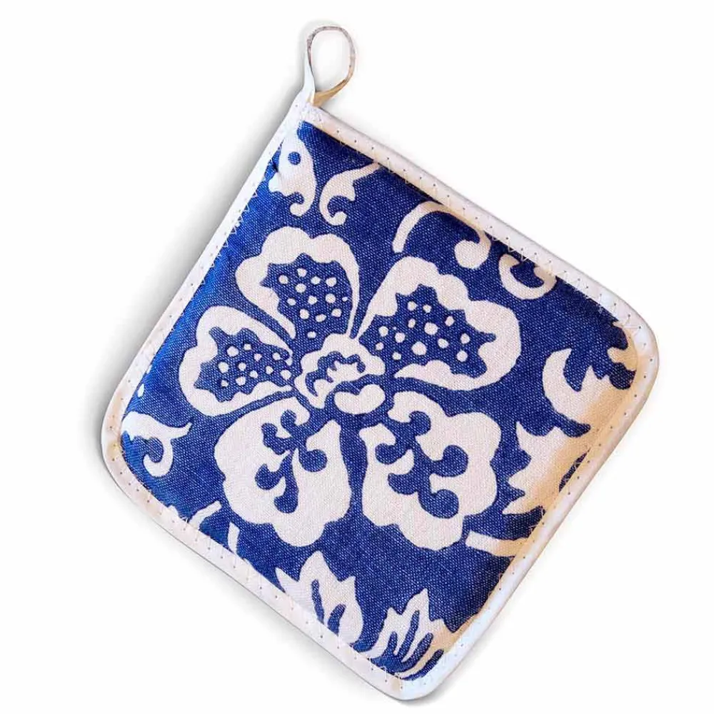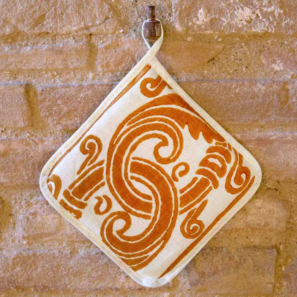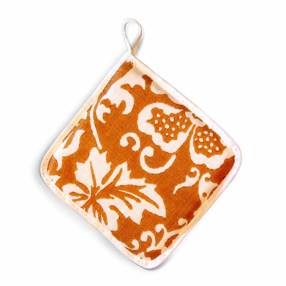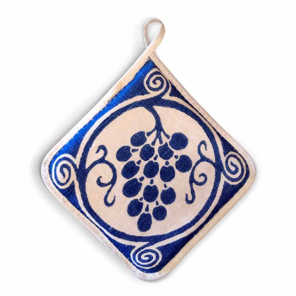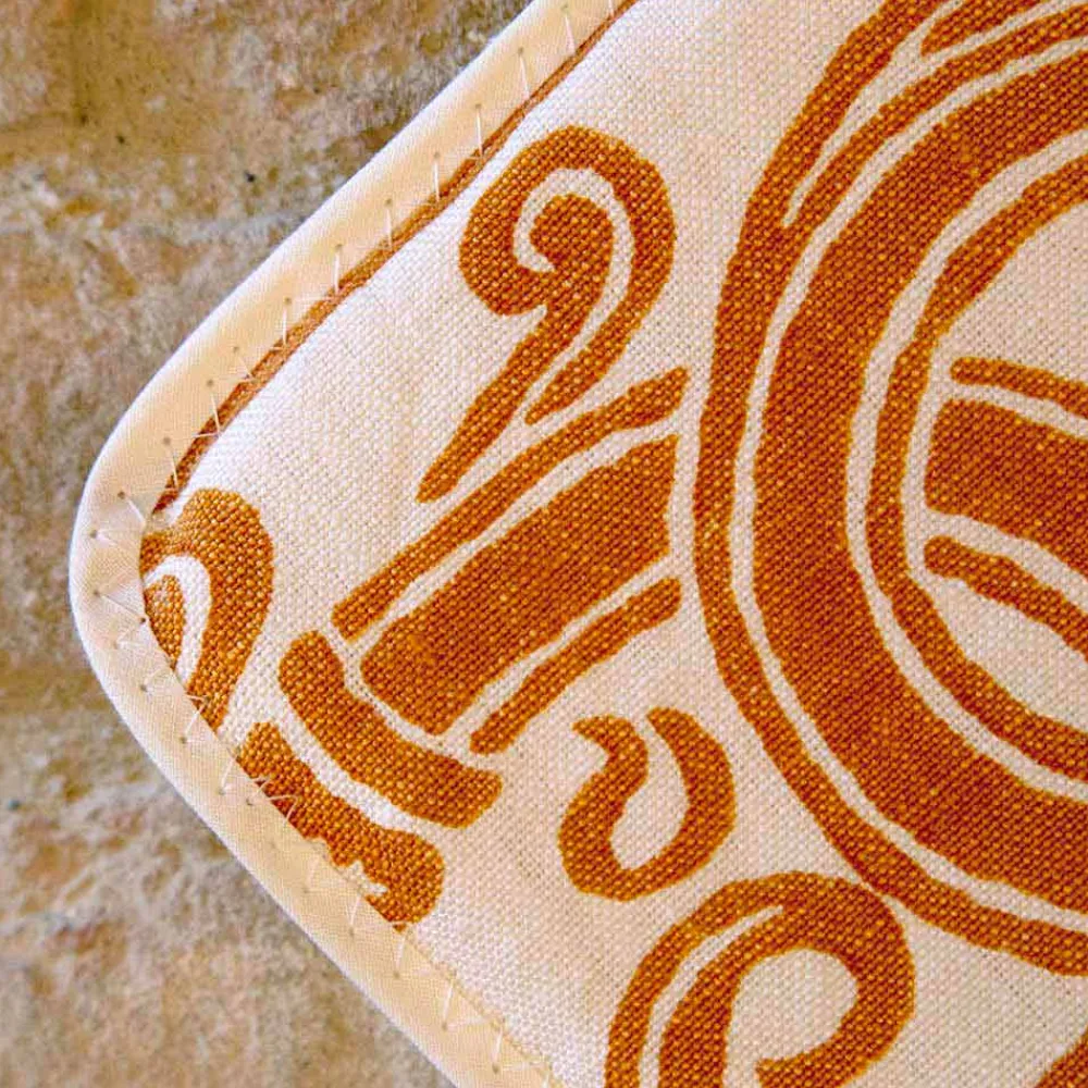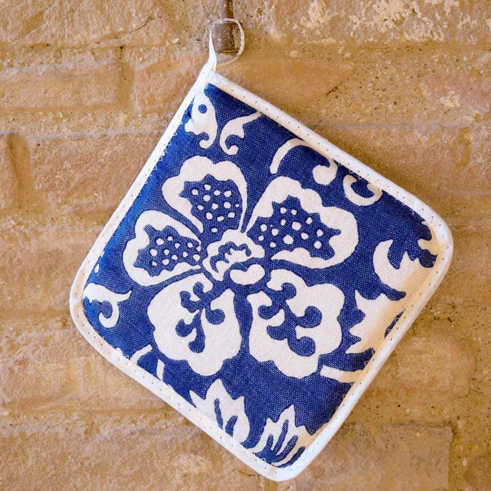 Topflappen aus reinem Leinen von hoher italienischer Handwerkskunst, dekoriert mit antikem handbedruckten Design, erhältlich in fünf Varianten, ein einzigartiges Kunstwerk aus Italien.