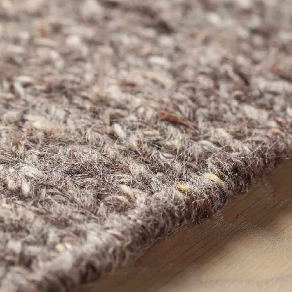 Die charakteristischen Merkmale dieser Teppichlinie sind die natürliche Kompaktheit und das dicke Wollgewebe mit faserigen und vollmundigen Texturen, die sich in einem flachen, organischen Schnittpunkt in brauner oder cremefarbener Farbe gegenseitig verfolgen.