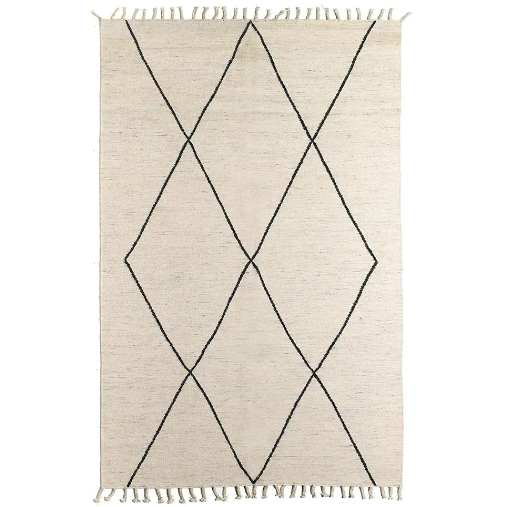 Dieser Teppich besteht aus Wolle und Baumwolle und wird “ Kelim “ oder ein haarloser Teppich genannt, der nicht geknotet, sondern von erfahrenen Webern handgewebt wird. Im Vergleich zu einem klassischen Teppich ist er leichter und weniger vollmundig und eignet sich perfekt als Dekorationsgegenstand, um das Dekor eines jeden Raums zu bereichern. Was das Produkt besonders auszeichnet, ist das geometrische Muster in Schwarztönen, das zusammen mit den Rändern, die die beiden kürzeren Seiten des Teppichs bedecken, Modernität verleiht. Die verwendeten Materialien und Techniken ermöglichen es, ein qualitativ hochwertiges Endprodukt zu erhalten, das die Aufmerksamkeit auf sich ziehen kann und jede Umgebung einzigartig macht.