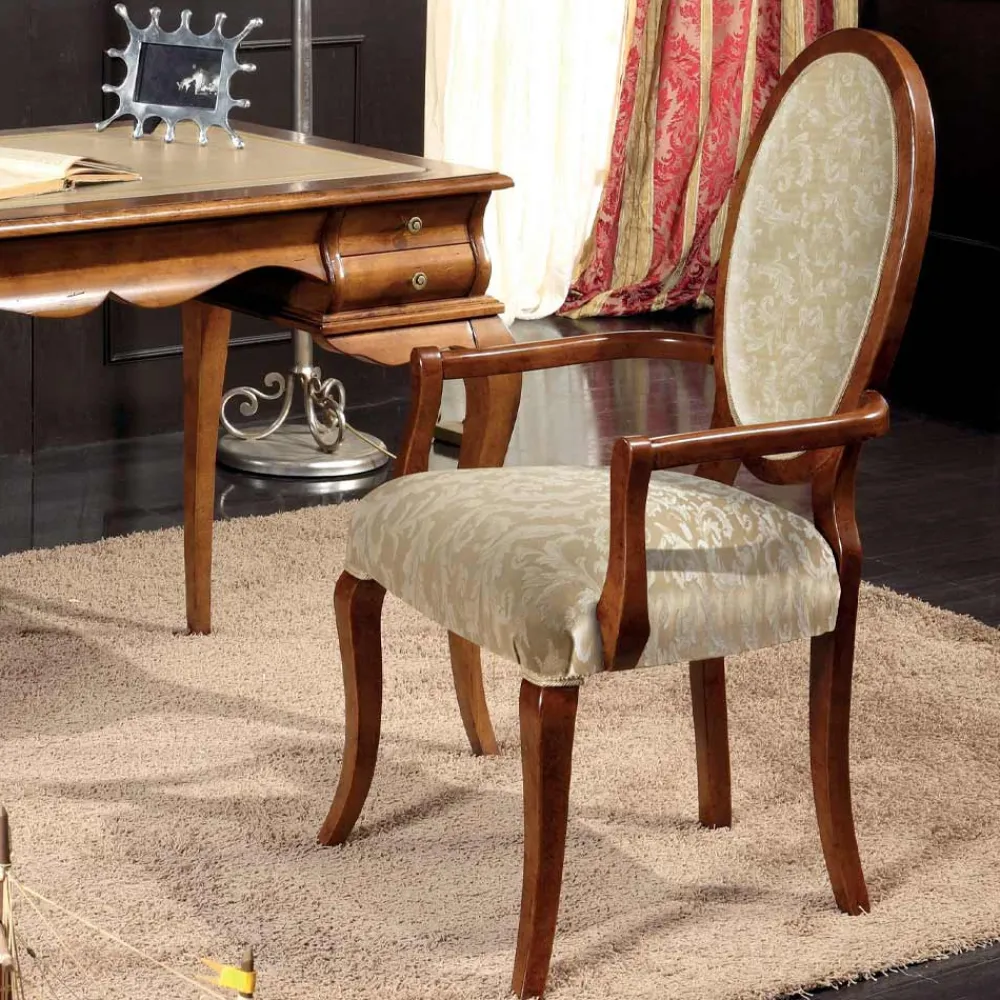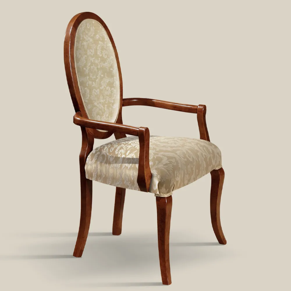 Esszimmerstuhl im klassischen Stil aus Holz mit Walnuss-Finish und gepolstertem Stoff , erhältlich in der Version mit oder ohne Armlehnen.