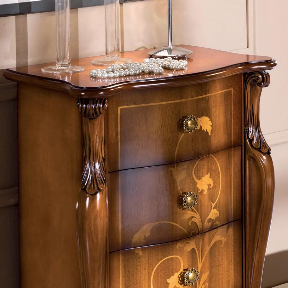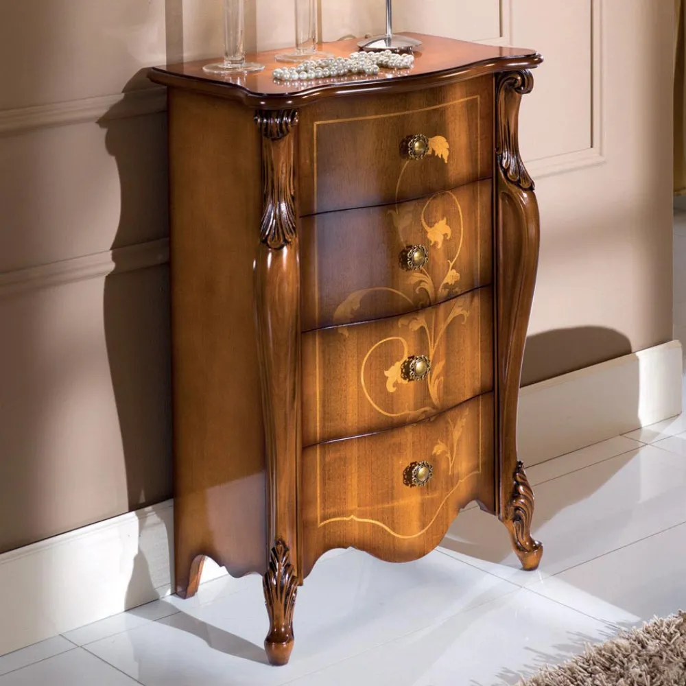 Nachttisch im klassischen Stil aus Bassano Nussbaumholz mit 4 Schubladen und Intarsien. Eine einzigartige und raffinierte Ergänzung, die vollständig in Italien von erfahrenen Handwerksmeistern hergestellt wird, Meister der Kunst, die jede Ergänzung mit Weisheit und Geschmack für Eleganz vervollständigen. Die Produktion erfolgt unter Verwendung hochwertiger Materialien und mit der größten Sorgfalt und Professionalität, die die Produkte Made in Italy auszeichnet .