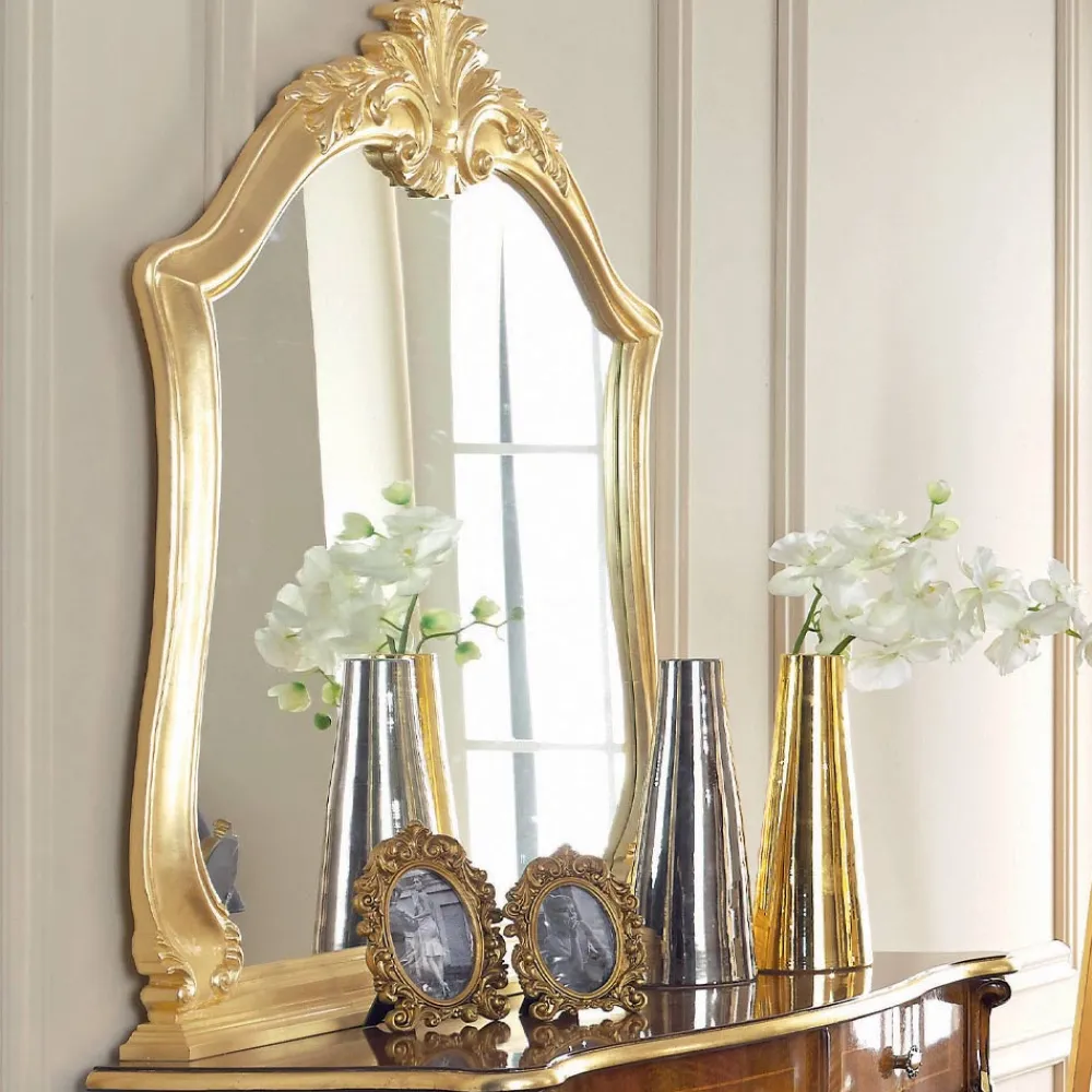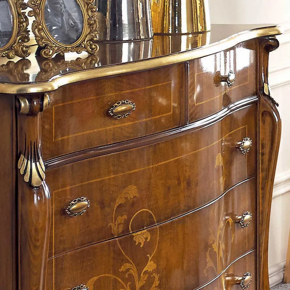 Kommode für Schlafzimmer aus Bassano Nussbaum und Altgold mit eleganten Intarsien und 5 praktischen Schubladen. Die Kommode ist auch komplett mit einem geformten Spiegel aus Holz, der mit Blattgold bedeckt ist. Eine einzigartige und raffinierte Ergänzung, die vollständig in Italien von erfahrenen Handwerksmeistern hergestellt wird, Meister der Kunst, die jede Ergänzung mit Weisheit und Geschmack für Eleganz vervollständigen. Die Produktion erfolgt unter Verwendung hochwertiger Materialien und mit der größten Sorgfalt und Professionalität, die die Produkte Made in Italy auszeichnet .
