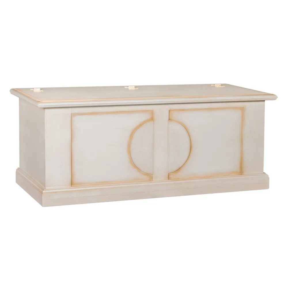 Truhe mit Struktur aus furnierten Holzpartikeln aus Tanganjika/Toulipier , Rahmen aus Toulipier/Ayous , Boden und Rückenlehne aus MDF und Sperrholz, vollständig in Italien hergestellt.