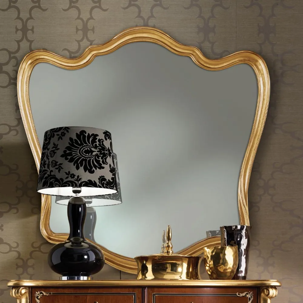 Geformter Spiegel mit Holzrahmen, der mit Blattgold verziert ist . Dank seines klassischen Stils ist dieser Spiegel ideal, um jeder Umgebung eine elegante und luxuriöse Note zu verleihen.