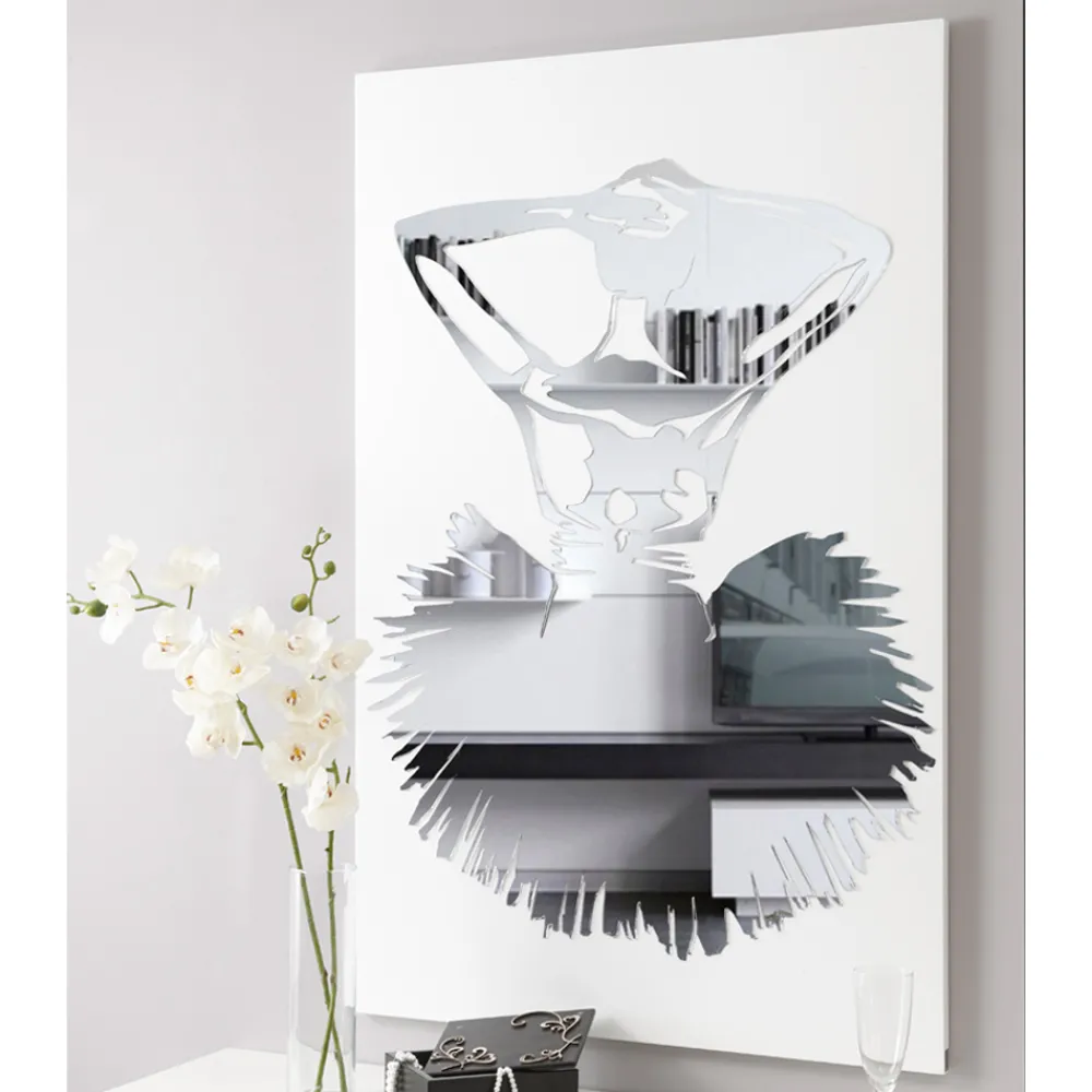 Die Dekorplatte wird mithilfe der Lasermarkierungstechnik hergestellt, die ein Flachrelief auf dem Material erzeugt und so unterschiedliche Farbabstufungen erzeugt. Das Bild besteht aus weiß lackiertem Holz mit Spiegeldekor. Es stellt eine Tänzerin dar, die auf Spiegelplexiglas gefertigt ist, was tatsächlich der Fall ist Funktioniert auch als Spiegel.