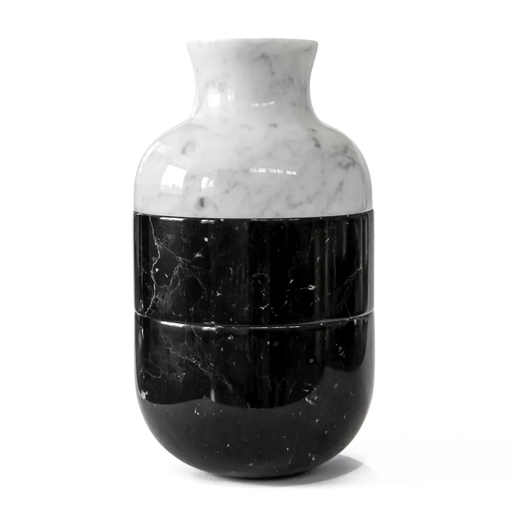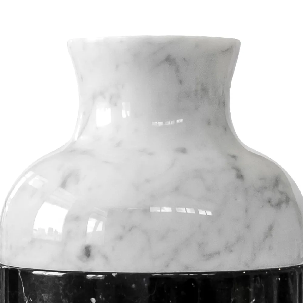 Diese dekorative Vase zeichnet sich durch ein handwerkliches und luxuriöses Design aus, das in 3 Teile unterteilt ist und vollständig aus weißem Carrara- und schwarzem Marquinia-Satinmarmor besteht.