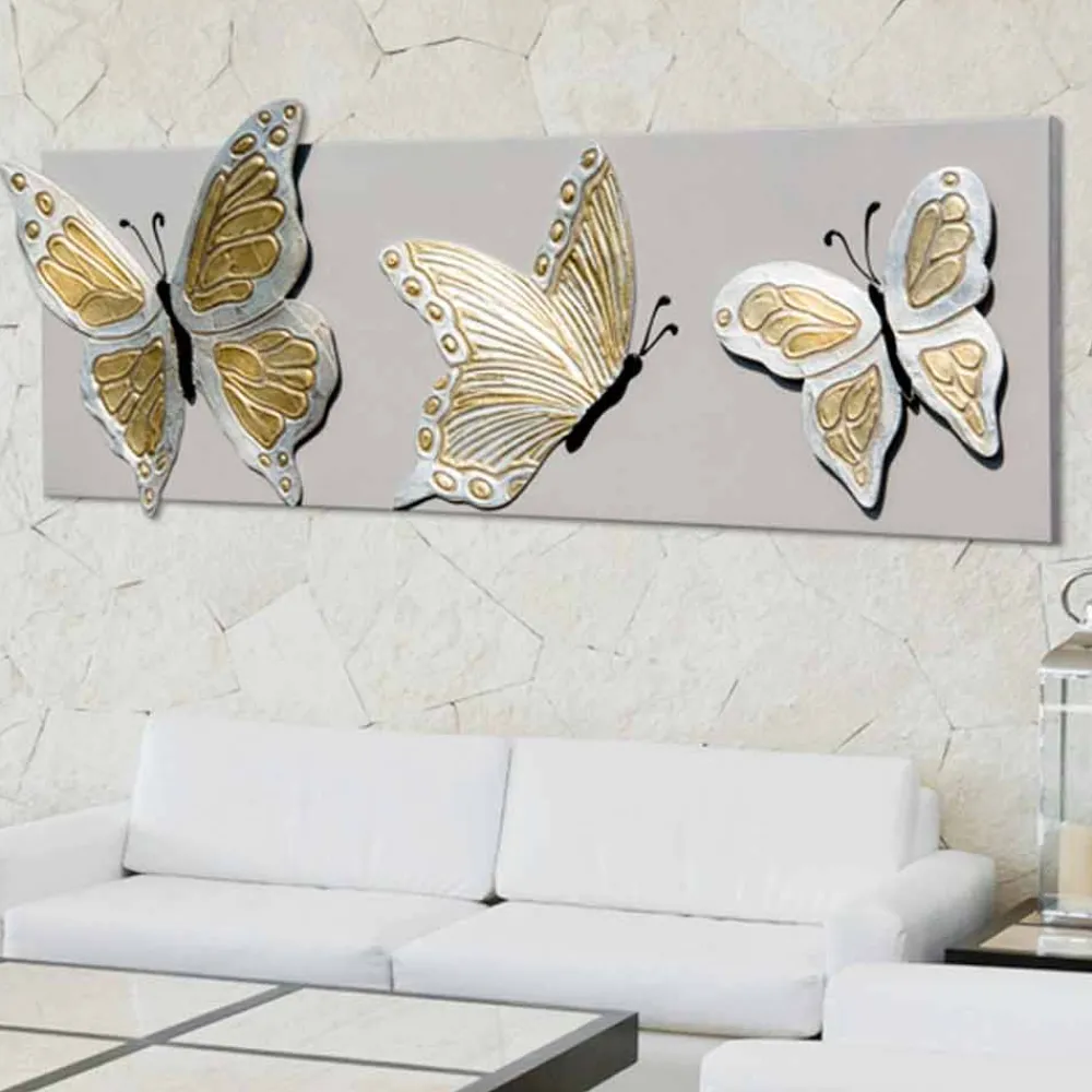 Das Bild ist mit geprägten Harzlementen, Blattgold und Blattsilber dekoriert. Auf dem Bild sind drei Schmetterlinge abgebildet.