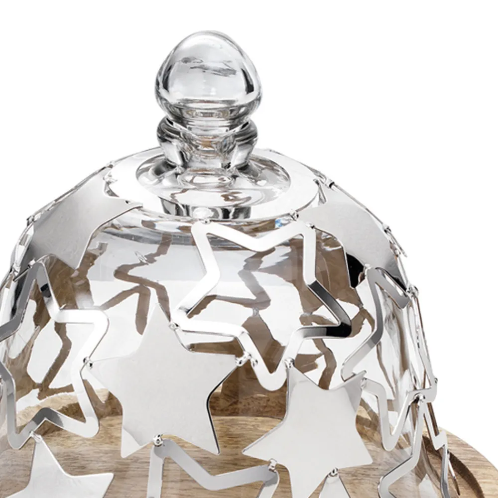 Dieser Kuchenhalter verfügt über ein raffiniertes und elegantes Glockendesign , komplett mit Holzboden und Glasdeckel mit sternförmigen silbernen Metalldekorationen.
