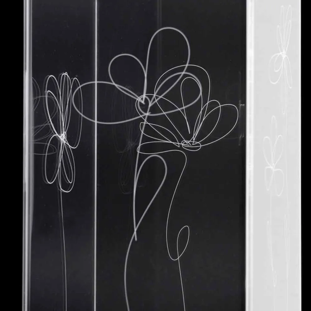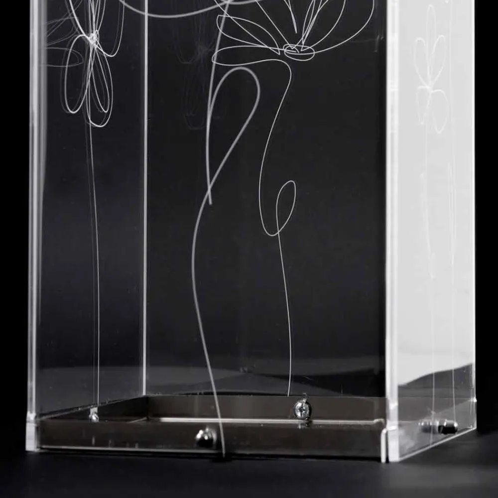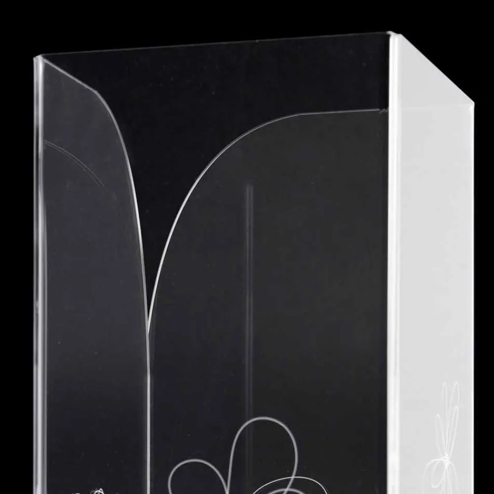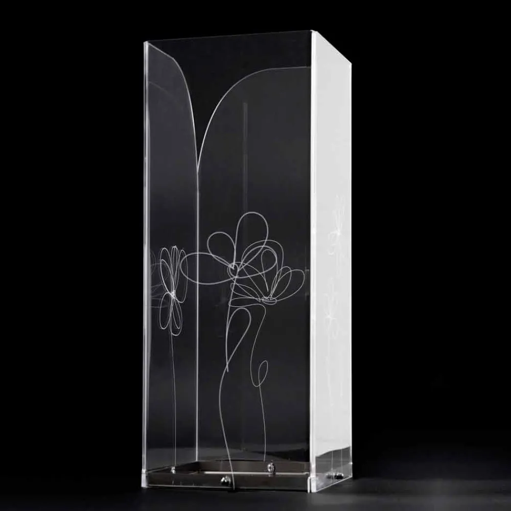 Schirmständer aus transparentem Plexiglas, das sich durch lasermarkierte Blumendekorationen im stilisierten Stil mit Edelstahlsockel auszeichnet.