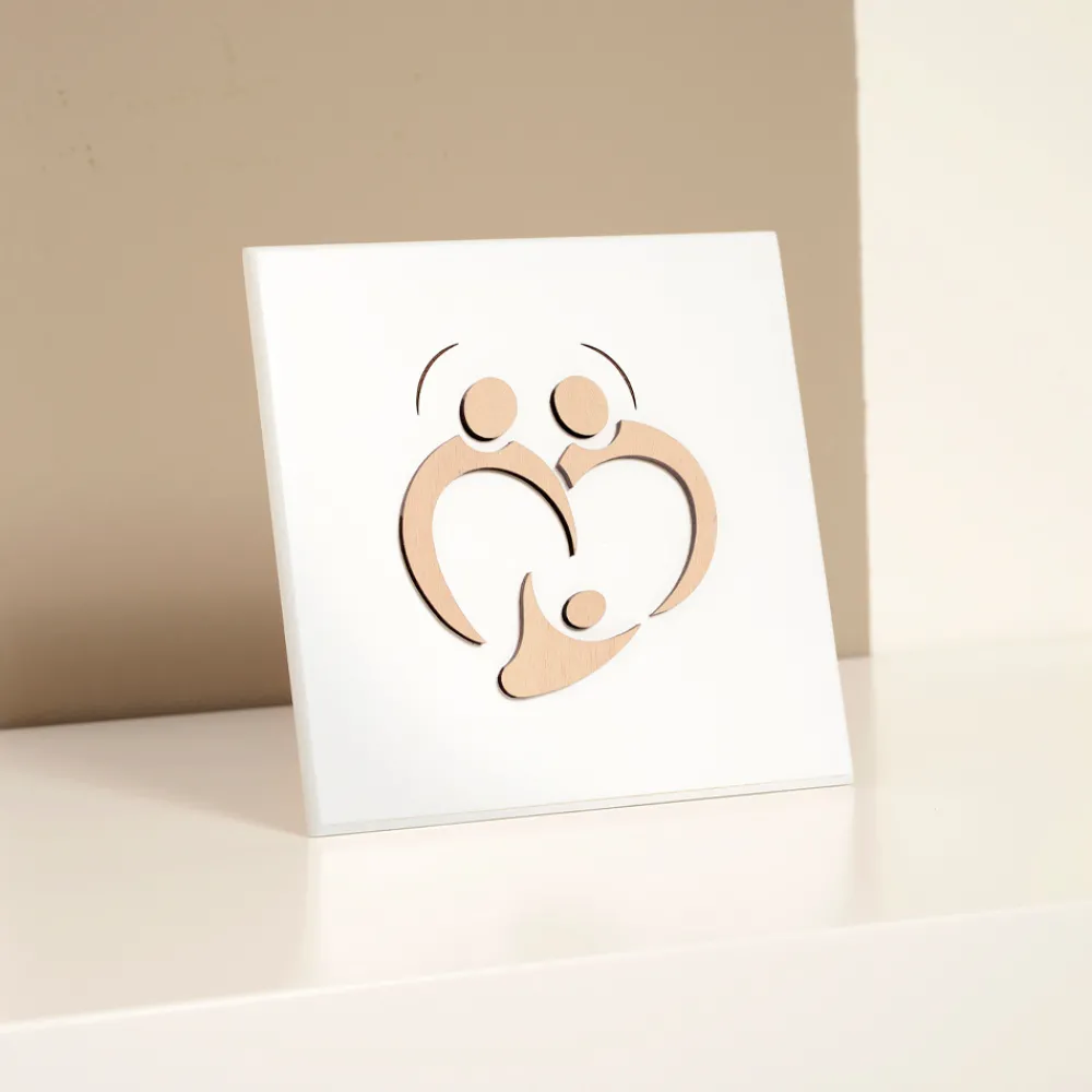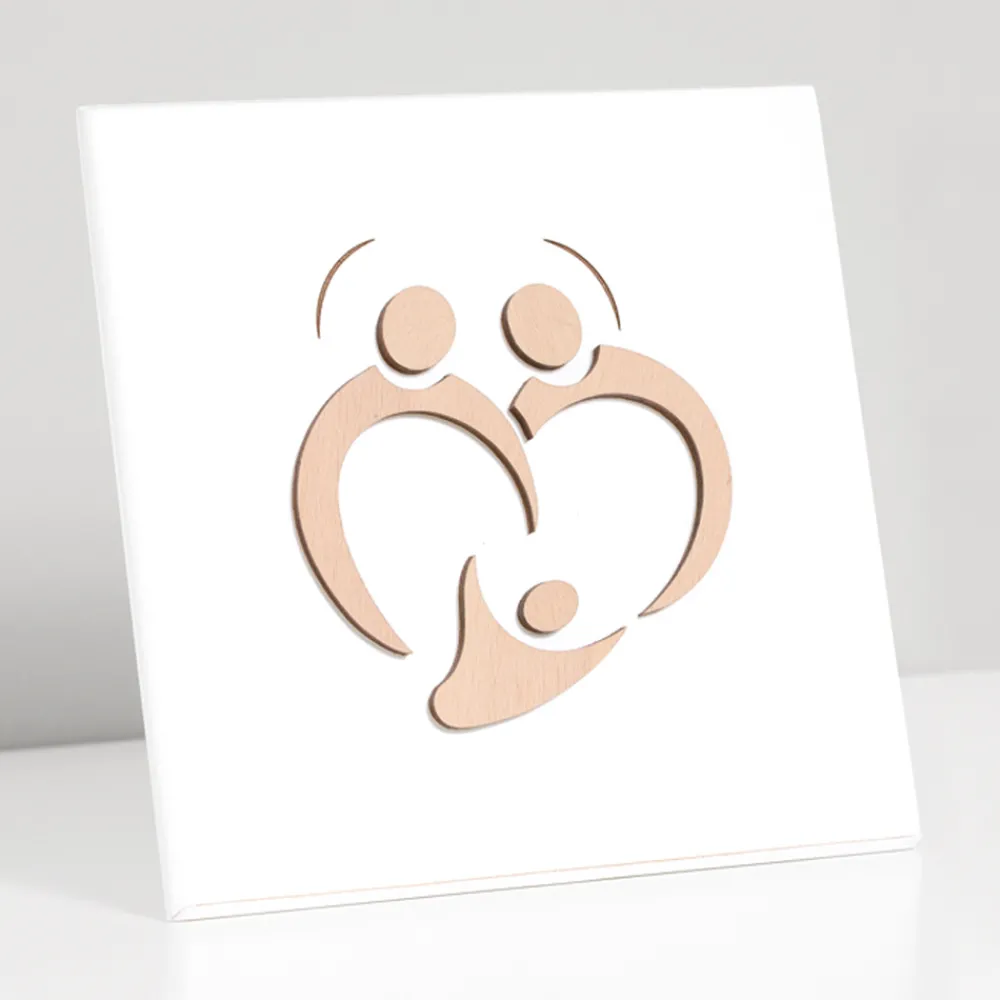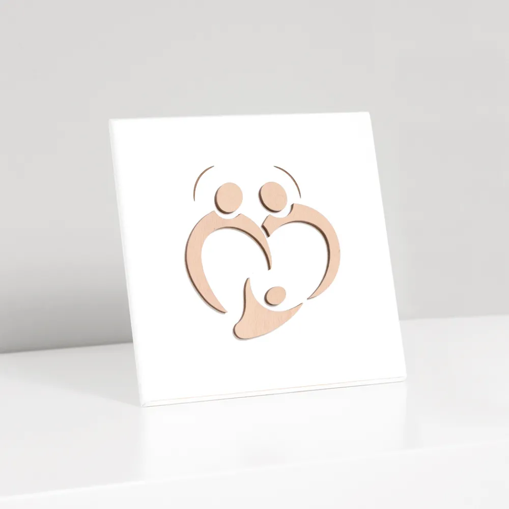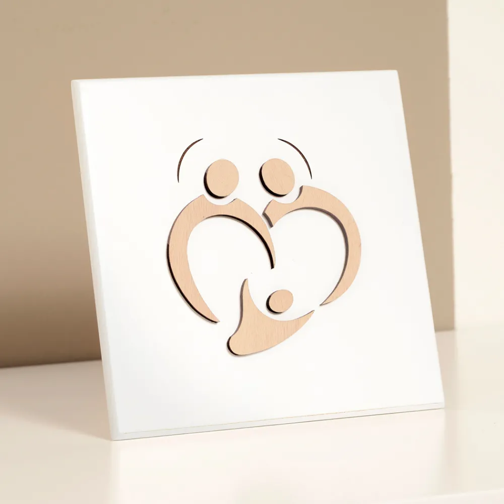 Dieses Gemälde ist das Ergebnis italienischer Handwerkskunst. Die Figuren werden von Hand gezeichnet und dann mit dem Licht des Laserstrahls bemalt, ohne jegliche Verschwendung und unter Berücksichtigung der Umwelt. Der minimalistische und essentielle Stil möchte nur die Süße hervorheben, die aus der Darstellung der Familie resultiert.