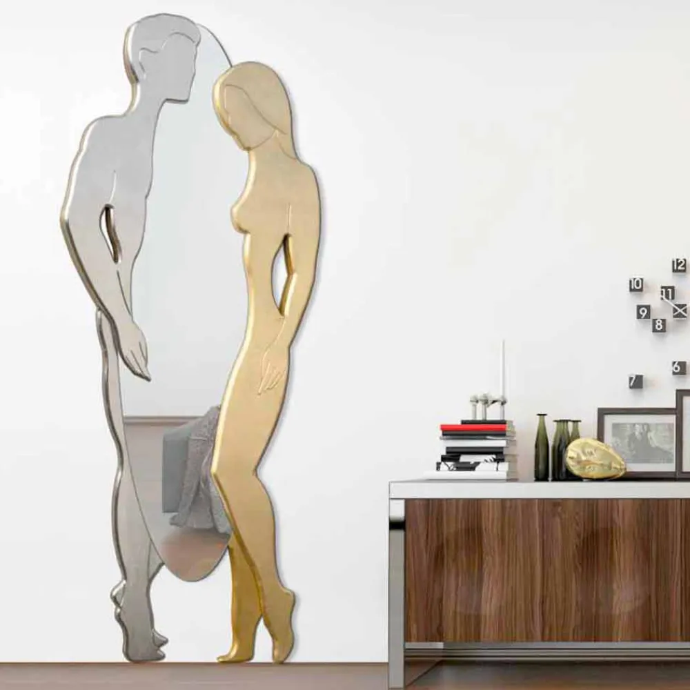 Der Spiegel ist aus MDF hergestellt und bildet Mann und Frau ab.
