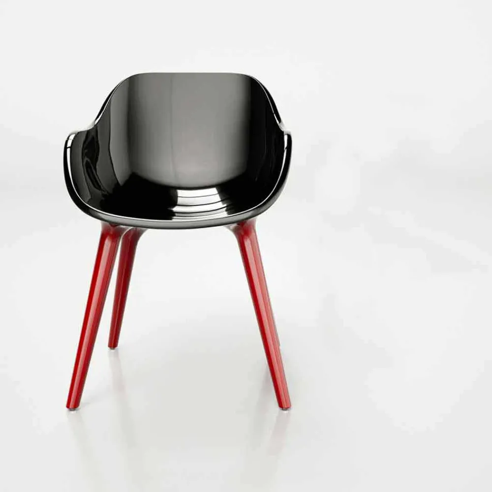 Die mit der Schale verschmolzenen Beine und ihre weichen Linien, die durch mehrere Farbkombinationen hervorgehoben werden, erwecken einen vielseitigen, chamäleonischen und zeitlosen Stuhl zum Leben.