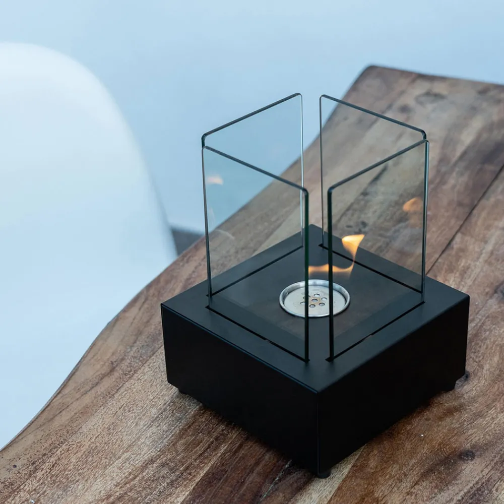 Tisch-Biokamin aus schwarz lackiertem Metall und gehärtetem Glas.